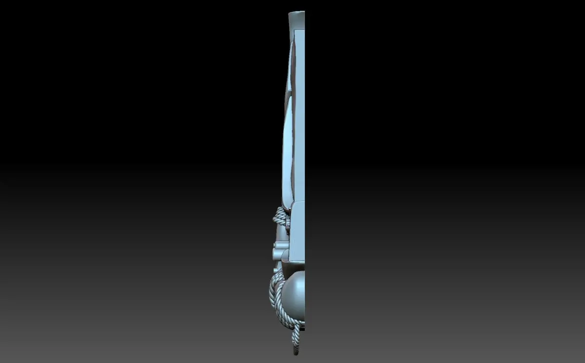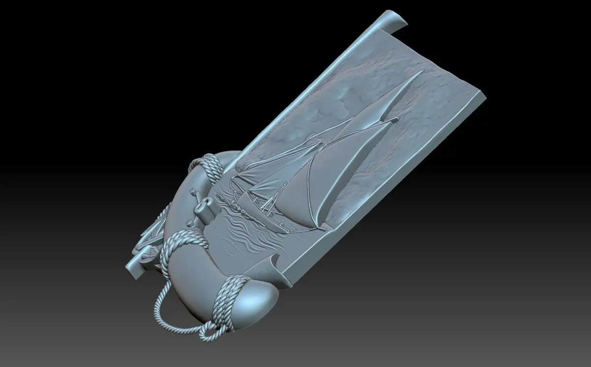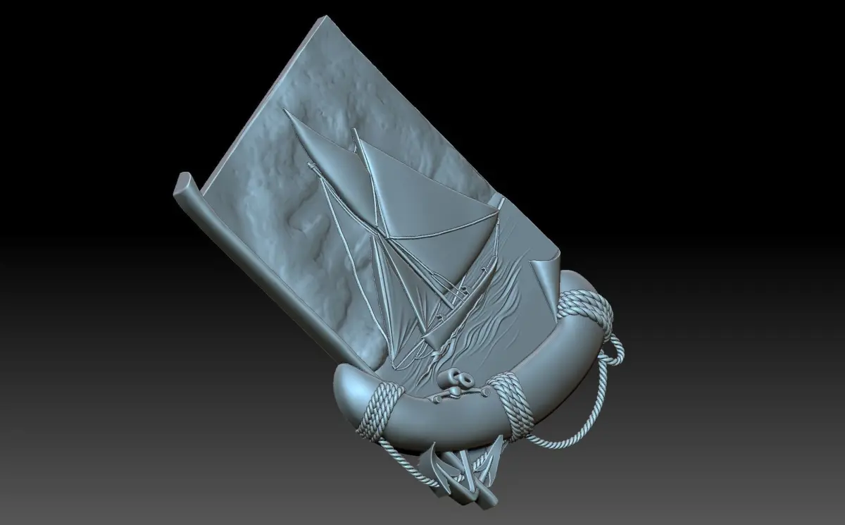 3d model of the bas-relief of a sailing boat. Against the background of the sea and sky, and a lifebuoy.
