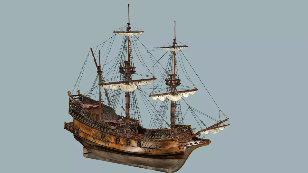 Galleon, sailing ship, reconstructed in exterior and interior detail, inspired by several galleons of the time, it is suitable for any project, includes high resolution textures, separate objects to reuse in other projects