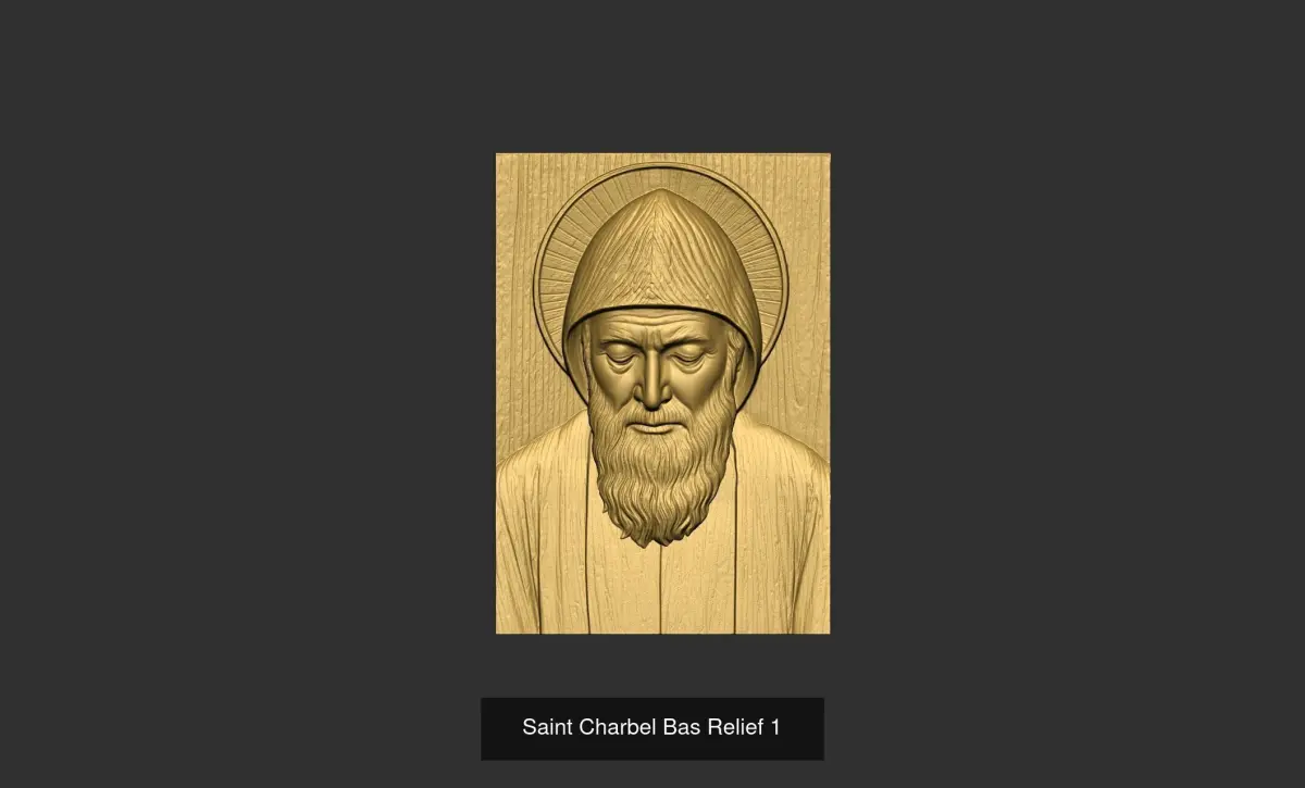 High-quality STL bas-relief models feature Saint Charbel Makhlouf, a revered Maronite monk and saint, depicted in a serene and spiritual posture.