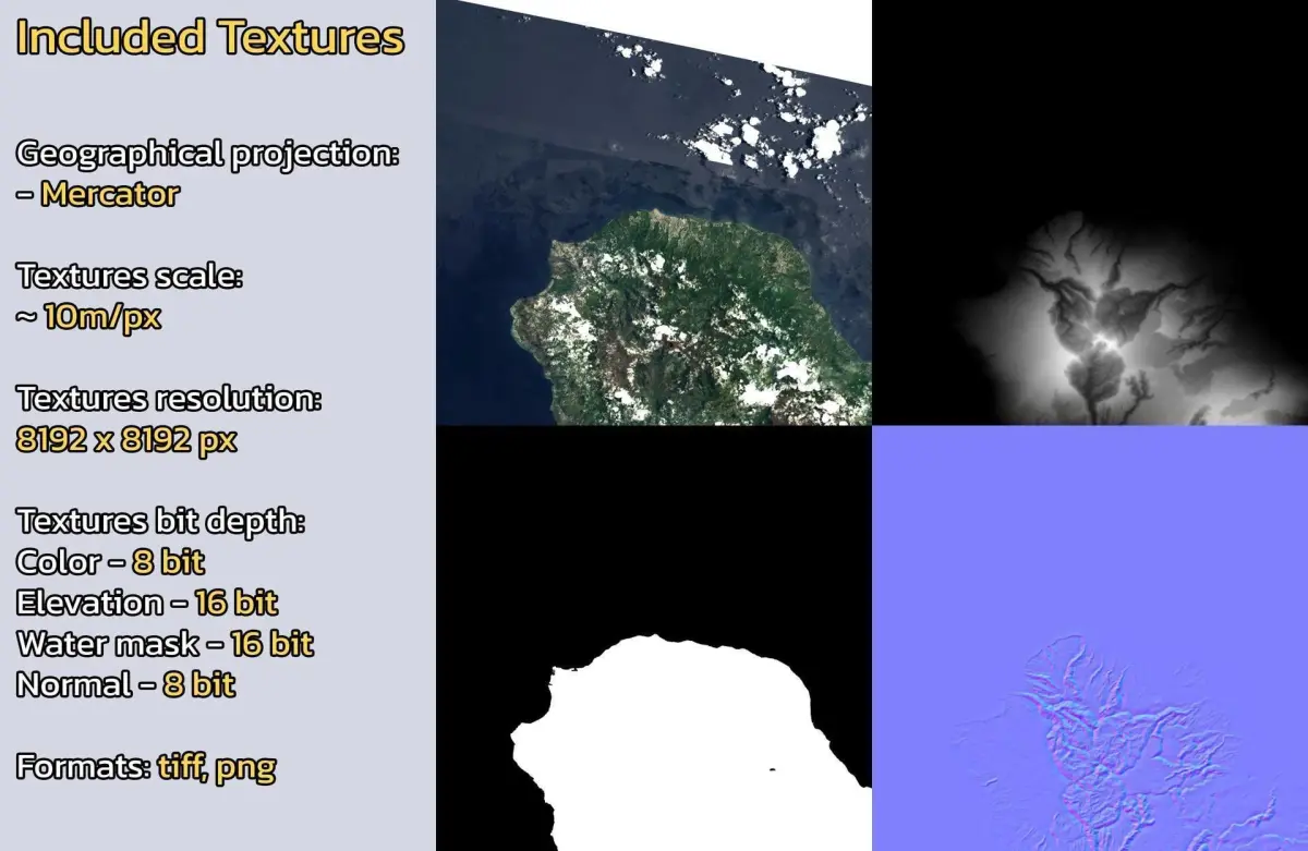 Warning: minor clouds/artifacts may be present on the diffuse color satellite texture due to the nature of the dataset. Check product images.