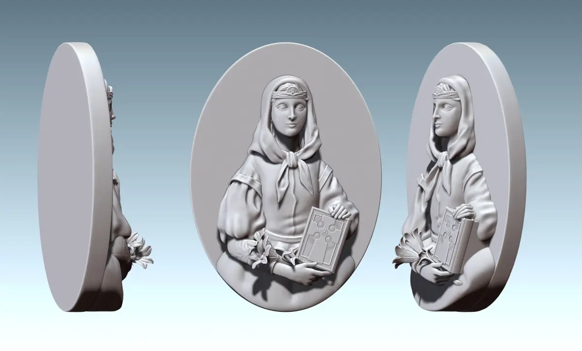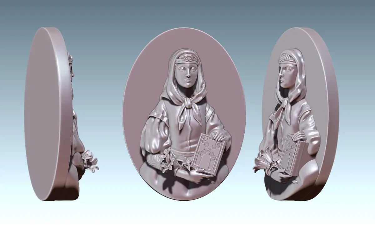 Three models are included (Stl, Obj and Vrml) Frame, Frame+Dymphna and Dymphna alone. It can be used to create other 3D models, for jewelry, for decoration, to create miniatures ...