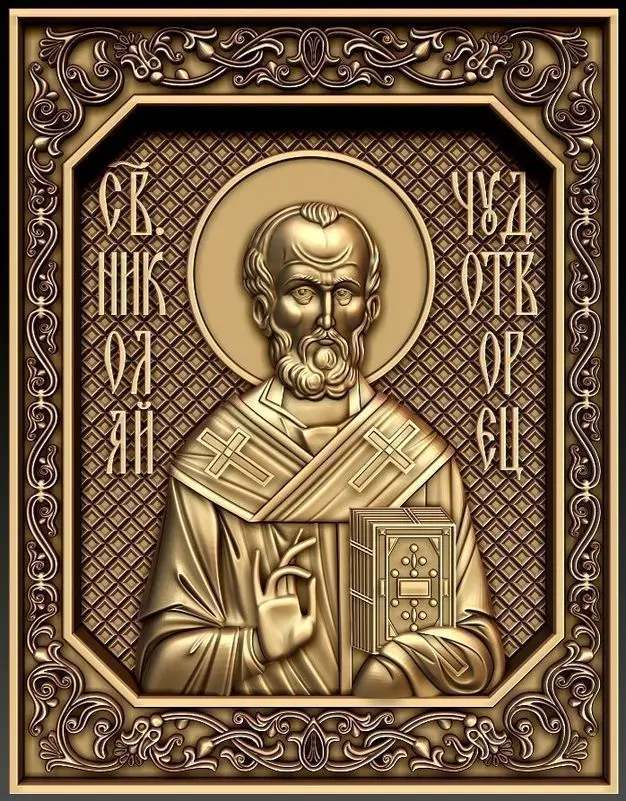 3d model Orthodox icon Saint Nicholas. 3d relief for cnc-sistems. 3d model Orthodox icon for milling on CNC machines. Can be used in the production of souvenirs, furniture, jewelry. Files in stl format, for import to artcam, rhinoceros, 3ds max, etc. You can scale the model to any size you need.