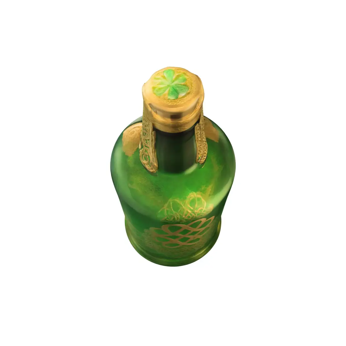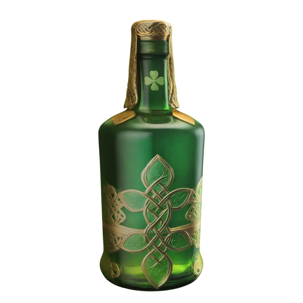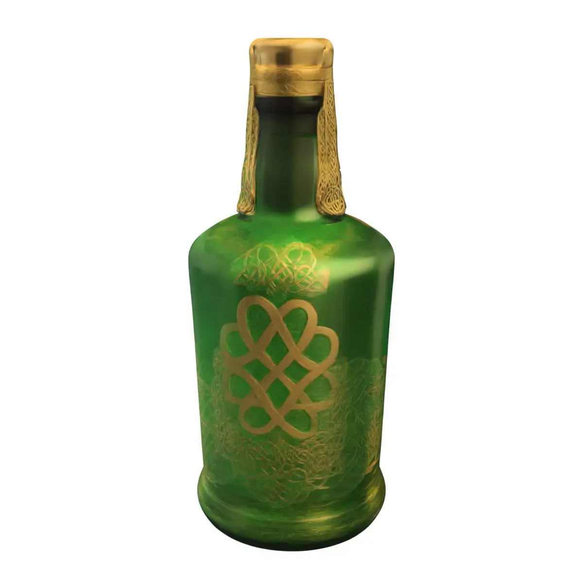A finely crafted 3D model of an elegant emerald-green potion bottle, adorned with intricate golden Celtic knotwork and a prominent clover emblem on the stopper. Ideal for use as a magical, medieval, or decorative prop in popular games like World of Warcraft, Skyrim, The Sims, VRChat, and Fortnite Creative. This versatile asset can serve as a potion container, collectible item, or ornamental element in fantasy environments. Delivered in multiple formats (OBJ, FBX, STL, DAE, PLY, GLB, Blender) for full compatibility with major 3D software and engines. Also optimized for high-quality 3D printing, perfect for cosplay props, themed decorations, or collectible displays.