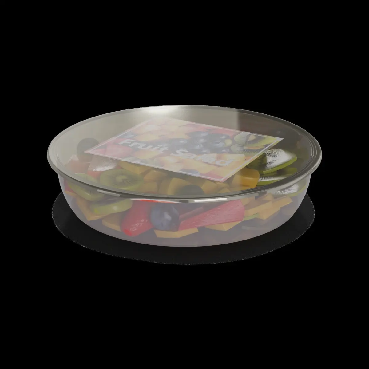 Fruit Salad: A refreshing fruit salad packed with a variety of seasonal fruits, such as juicy watermelon, sweet strawberries, tangy pineapple, and succulent grapes. Packaged in a round plastic container with a yellow lid and a label that features a picture of the salad and the words Fruit Salad in bold white letters.