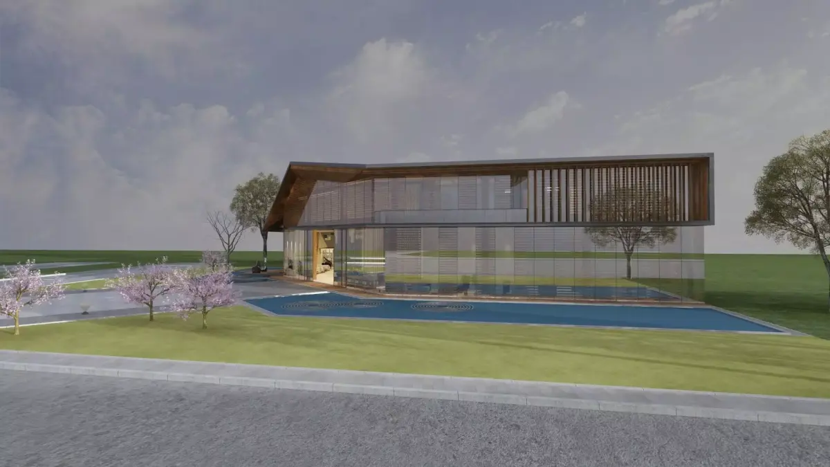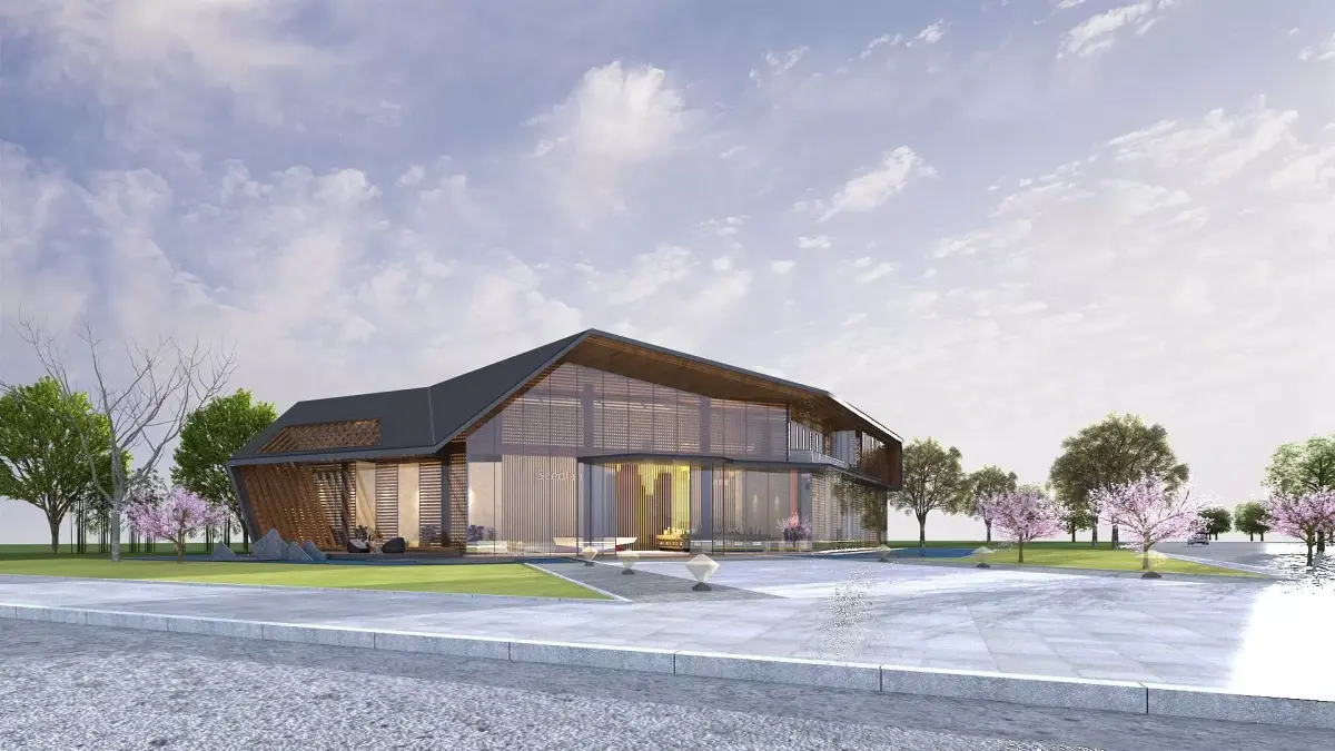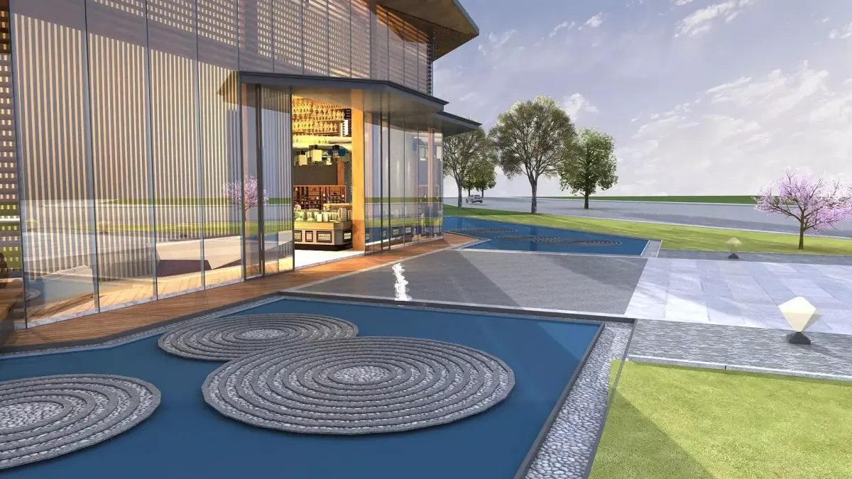 Office building concept with simple interior and outdoor trees (12 vrmesh-files).