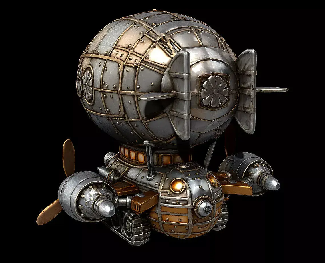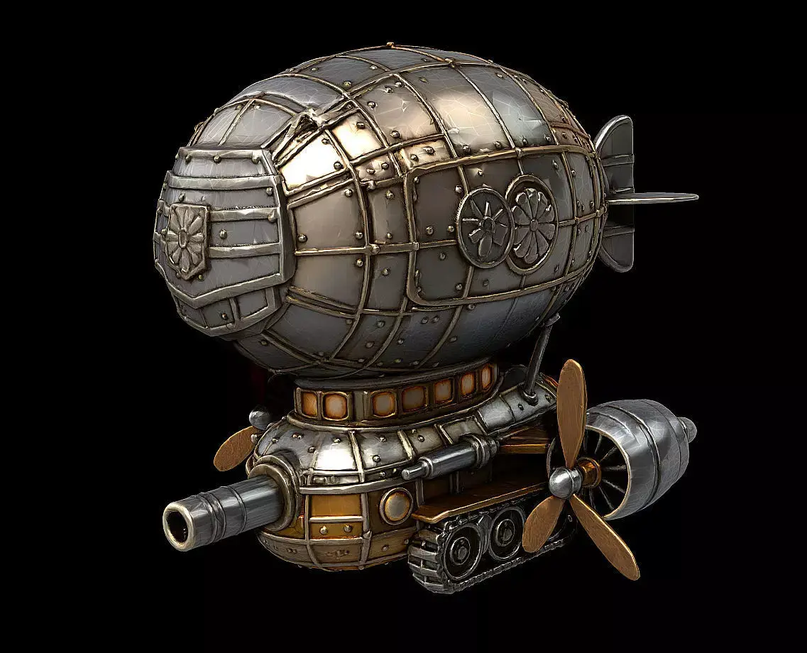 A stylized samurai-themed armored airship, blending traditional Japanese aesthetics with fantasy engineering.The design features a large plated balloon section reinforced with riveted armor, a compact tracked engine base, and twin propeller drives—creating a fusion of warrior-era ornamentation and retro–fantasy aviation.