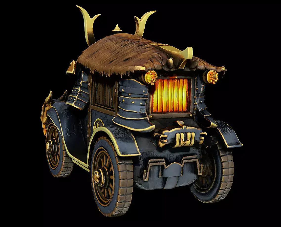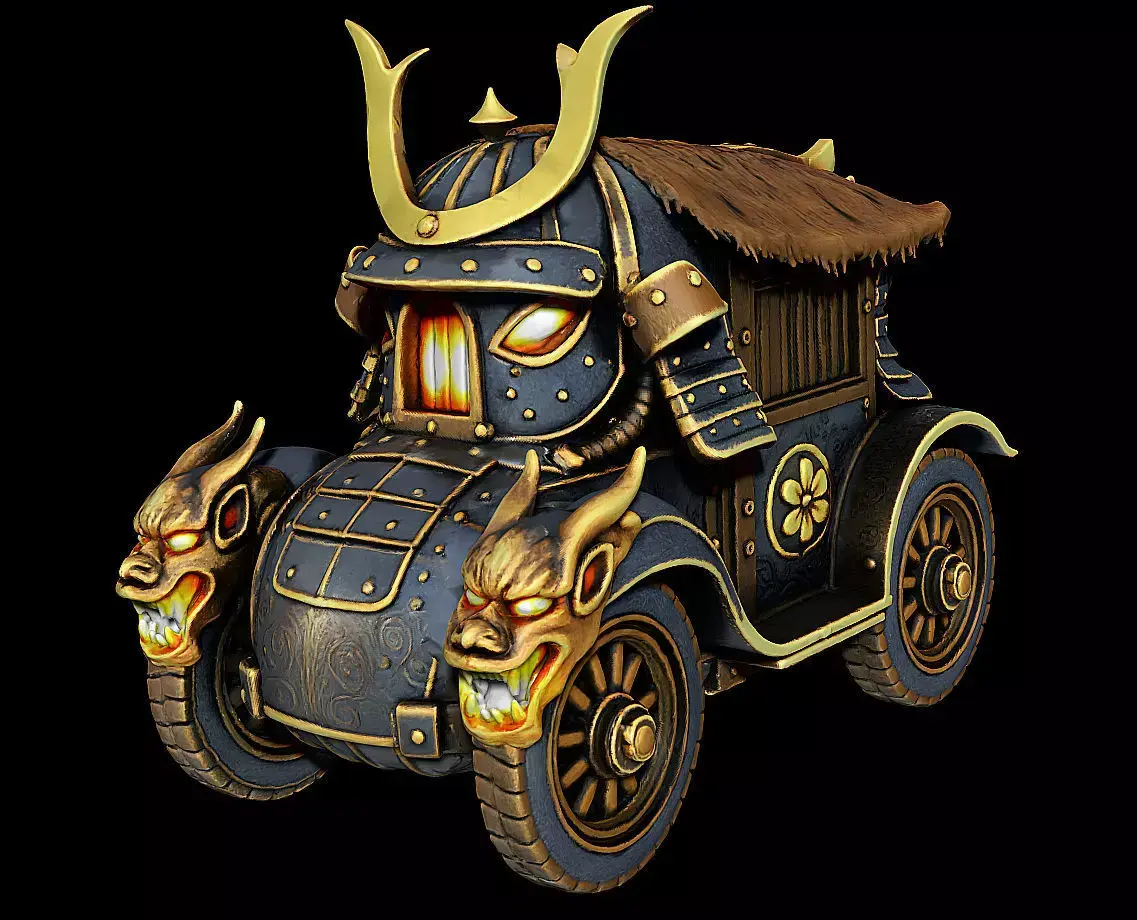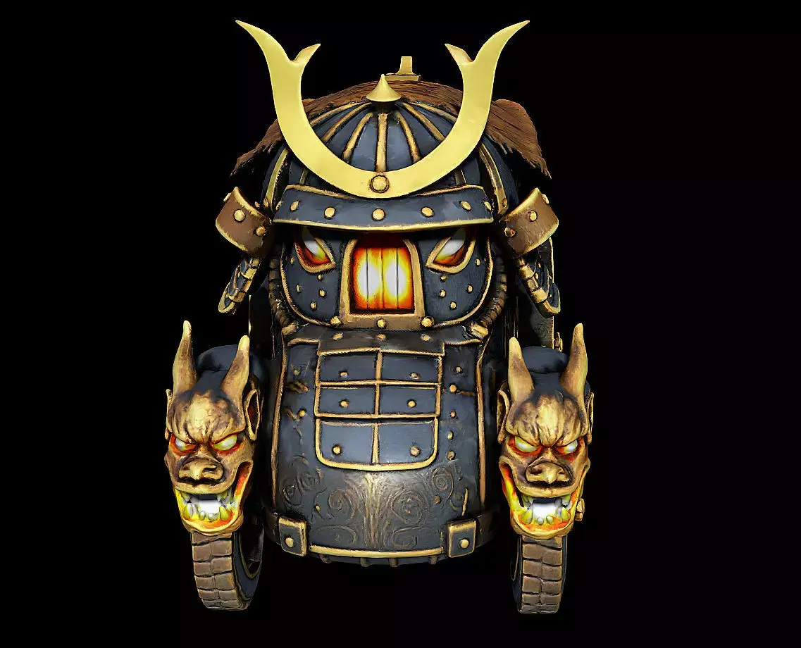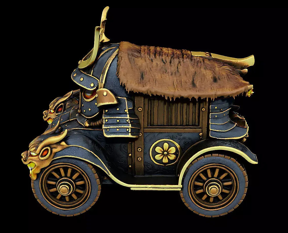 Designed as a hero-quality model for both 3D printing and high-detail game production, this carriage features expressive oni-face ornaments, a ceremonial kabuto-style front armor, and a fortified coach structure reminiscent of historical war wagons.