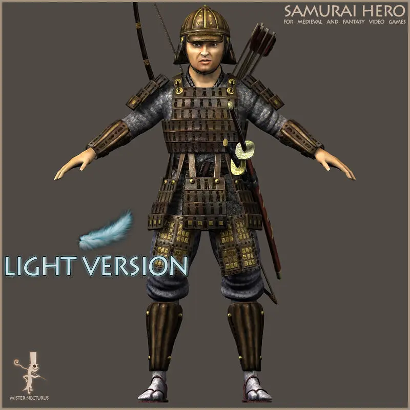 Body with cap and sandals has 7,076 polygons, 13,953 triangles and 7,457 vertexes. Samurai with heavy armor equipped has 9,670 polygons, 19,067 triangles and 10,513 vertexes.Samurai with warlord armor equipped has 10,875 polygons, 21,425 triangles and 11,519 vertexes.Weapons 2,541 polygons, 4,992 triangles and 2,833 vertexes.
