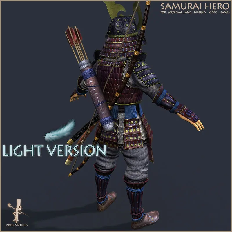 Character has 10 parts: straw cap, back hair tail, helmet, shoulder armor, leg armor, hand armor, chest armor, sandals and belt. Model has 2 katanas, 2 small japan swords wakisashi, 2 bows, quiver with arrows. Each part can be removed/hided.