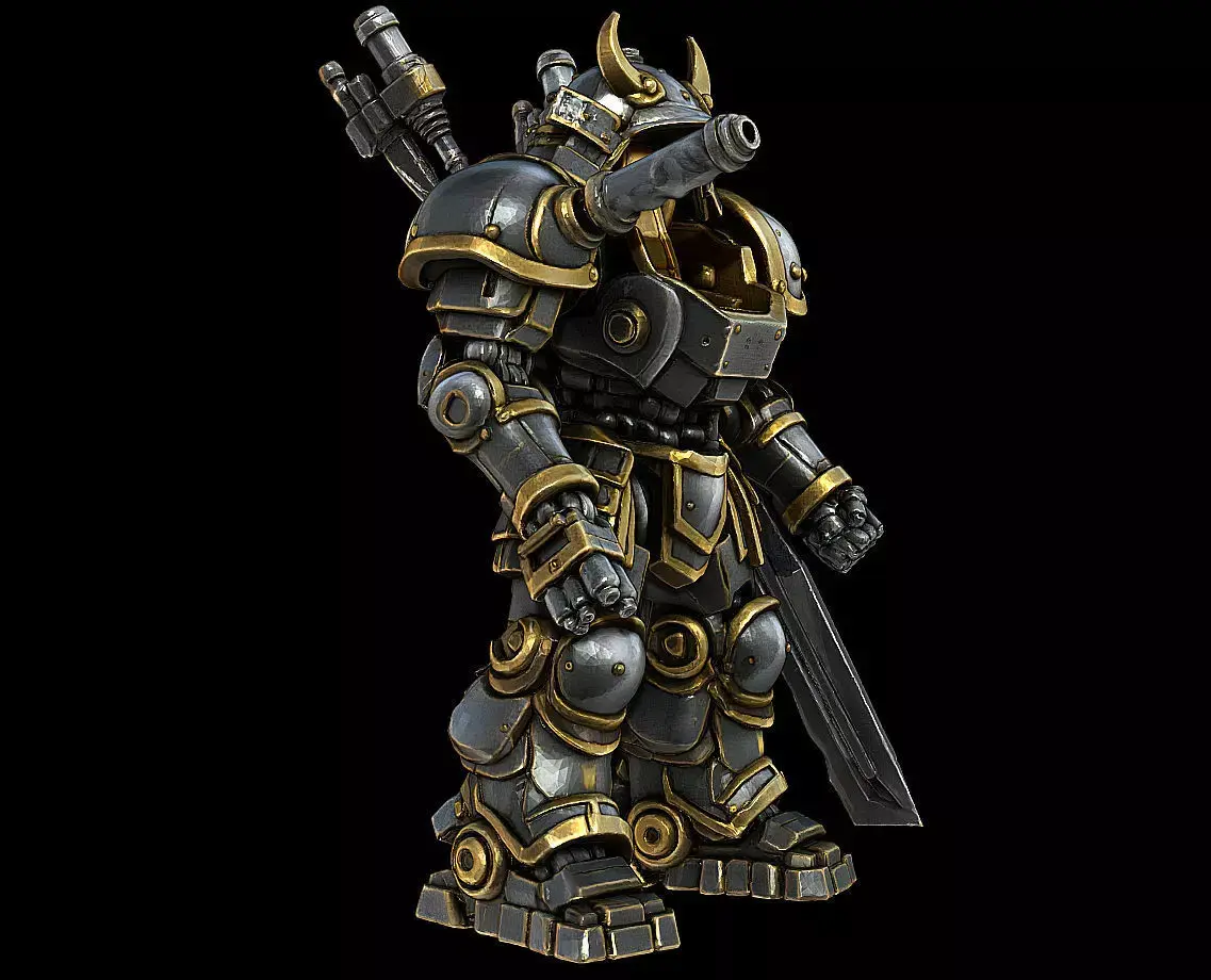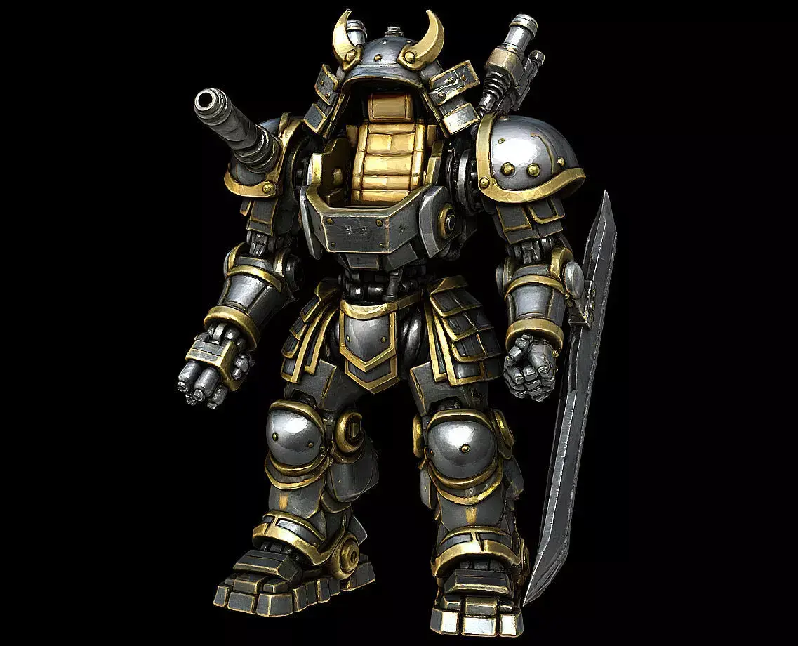 A stylized high-detail 3D model of a Samurai-themed combat mecha, merging traditional Japanese armor design with a powerful mechanical frame.This sculpt recreates the imposing presence of a Shogun-class war machine — reinforced plating, functional joints, heavy weaponry, and a bold armored silhouette.