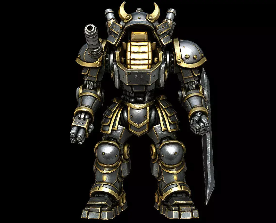 Thick armor plates sculpted with wear, panel lines, and engraved accents