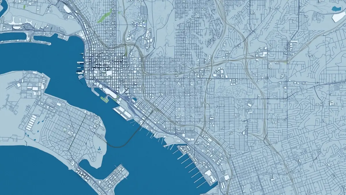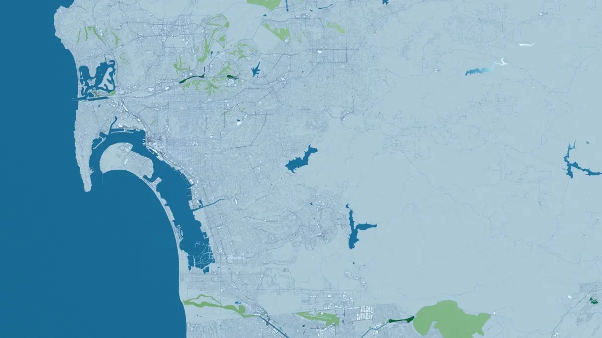 This is a 2019 OSM map version of a full San Diego city and surroundings, including terrain
