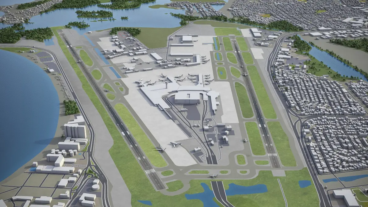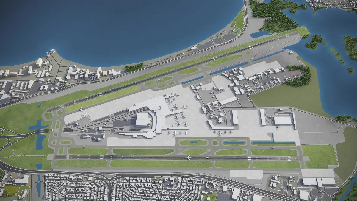 This is exact and accurate to scale 3D model of Aeropuerto Internacional Luis Munoz Marin - SJU and its surrounding area based on GIS data (January 2020)