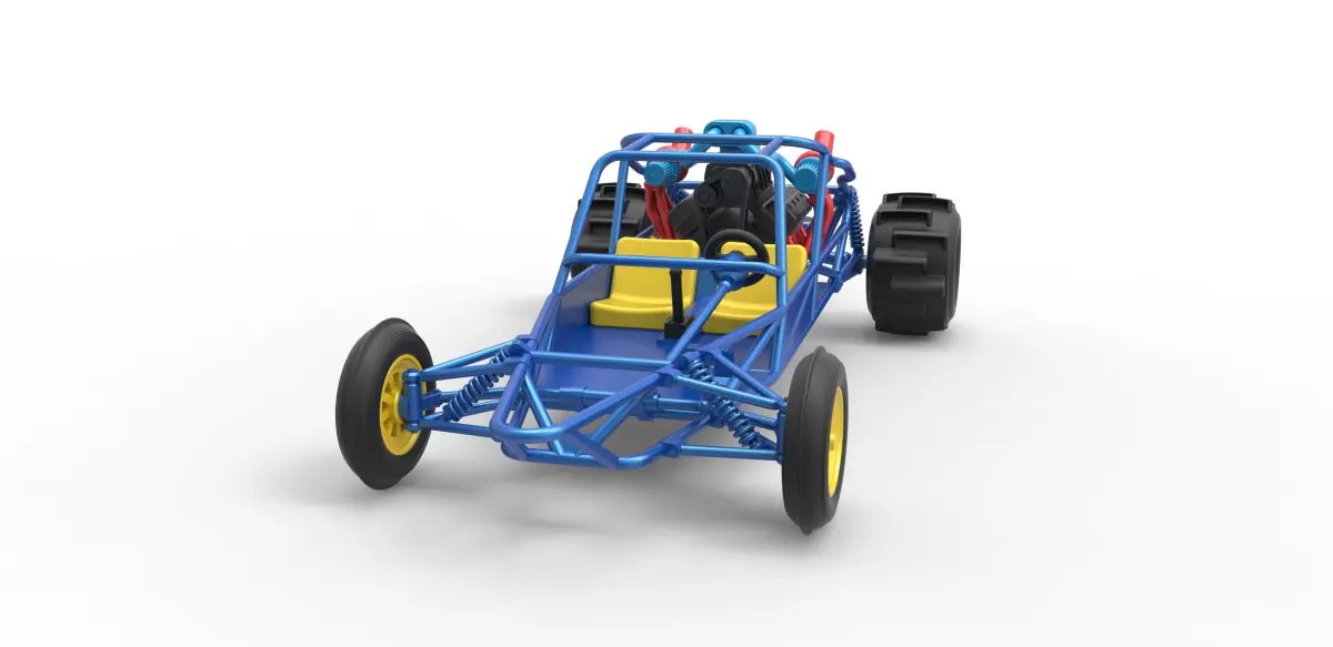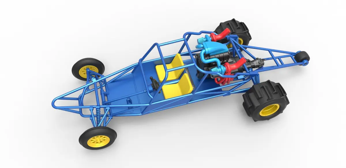 The model consists of parts: Air intake, Body, Engine main part, Front rims, Front tires, Gear shifter, Left compressor part, Left exhaust part, Rear rims, Rear tires, Right compressor part, Right exhaust part, Rod, Seat, Steering wheel, Tank, Wheelie bar pin, Wheelie bar wheel.