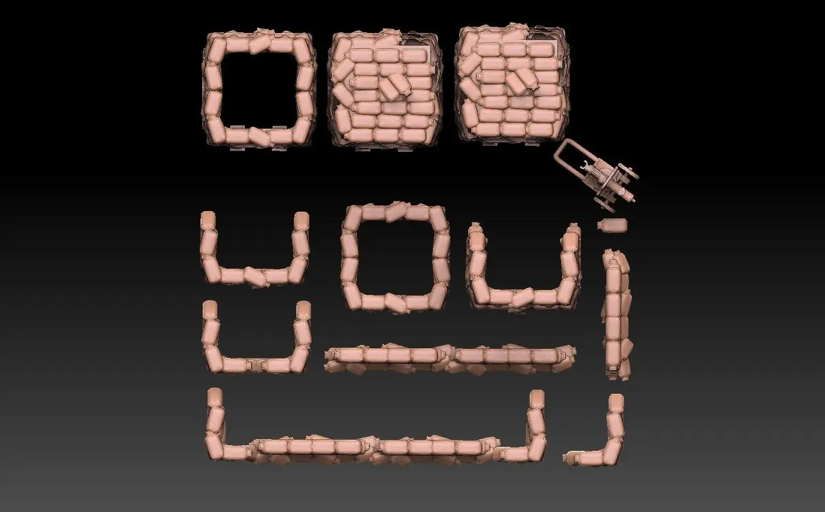 Basic sandbag barricades and fortifications. Usable in tabletop games, from 6mm scale and upwards. Use the images in the image gallery too see a presentation of all 13 model parts included in the model pack.Also included is a Maxim DP1910 machine gun, that fits the sandbags stylistically. Printing the Maxim at sub-20mm scale is not recommended.