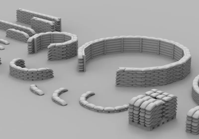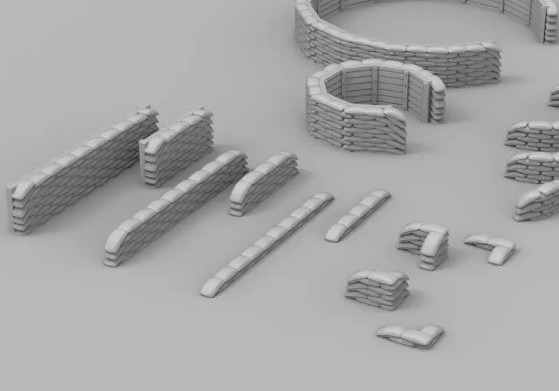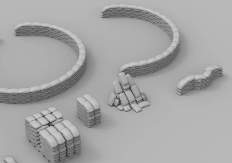 This 24 piece model pack contains various types and piles of sandbag emplacements. Tall, short and shallow walls, corners, curves, circles and piles. Suitable for miniature wargaming, battlefield or siege diorama building and low poly video game design. Best used when combined to each other with weathering finish.