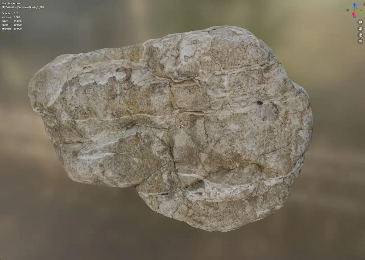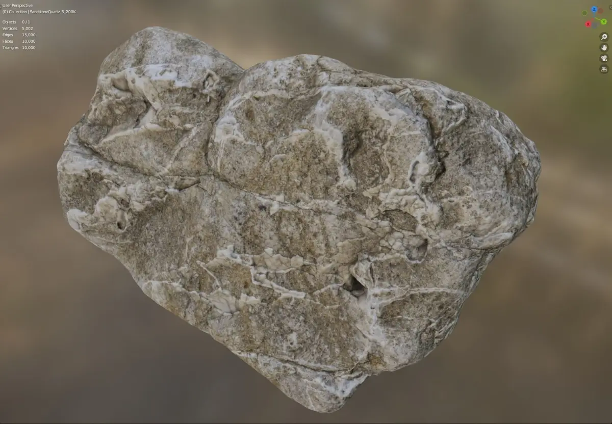Photorealistic weathered sandstone with quartz made from Photogrammetry. 8K Texture Files : Color, Normal, and Ambient Occlusion. Model origins are centered by mass. Models are provied as FBX and OBJ for maximum interoperability with 3d programs and game engines. LODs are available with the following face counts: 1K, 5K, 10K, 200k, 2Mil, 15Mil