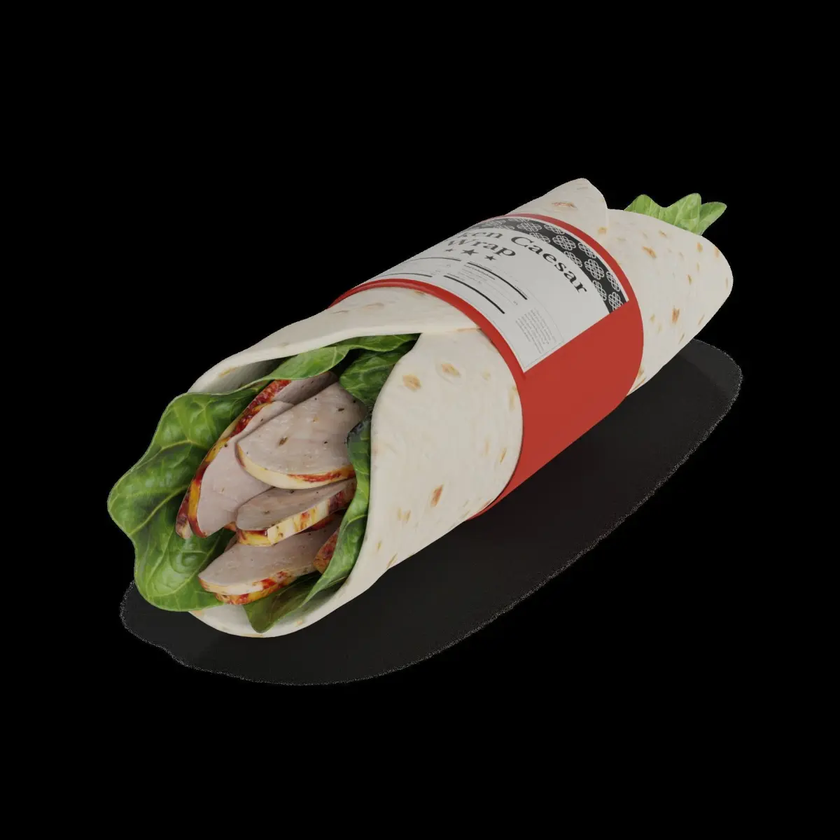 Chicken Caesar Wrap: Tender grilled chicken, crunchy romaine lettuce, and zesty Caesar dressing wrapped in a soft flour tortilla. The packaging features a sleek, resealable plastic pouch with a modern design. The label showcases the name Chicken Caesar Wrap in elegant typography, accompanied by a graphic of a chicken and lettuce. Size: 10 inches.