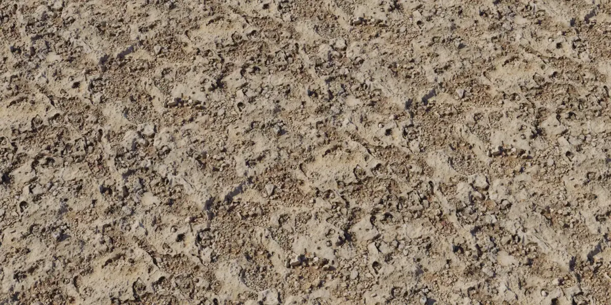 A tileable pale sandy‑mud material densely seeded with coarse aggregate, pebble clusters, and crusty ridges for convincing dry riverbeds, construction sites, and arid paths. High‑fidelity detailing preserves crumbly edges, embedded stones, and soft mounding, delivering strong scale cues without obvious repetition in close‑ups or wide terrain sweeps. Delivered as calibrated 4K PBR maps—BaseColor, Normal (OpenGL), Roughness, Height/Displacement, and Ambient Occlusion—compatible with Blender, Unreal Engine, Unity HDRP/URP, Substance, V‑Ray, and Corona. Drive parallax or true displacement with the Height map to push ridge and pebble relief, and modulate Roughness to art‑direct from chalky matte dust to lightly compacted satin mud. Ideal for quarry yards, track shoulders, desert passes, and any environment needing gritty sandy earth with rich micro‑detail.