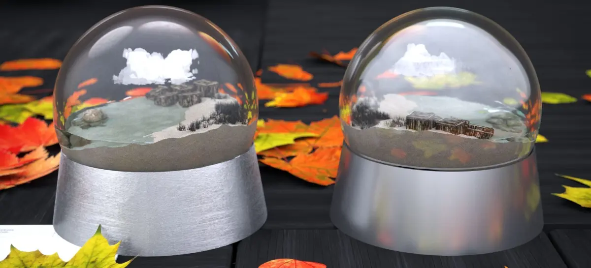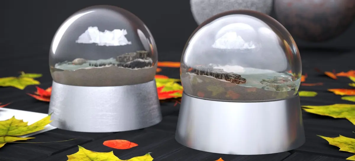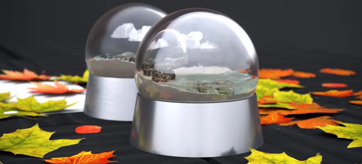 PRODUCT BRIEF DESCRIPTION: "A Snow Globe with a scenery of sandy white beach, clear ocean water, crates, and dried-out grass.