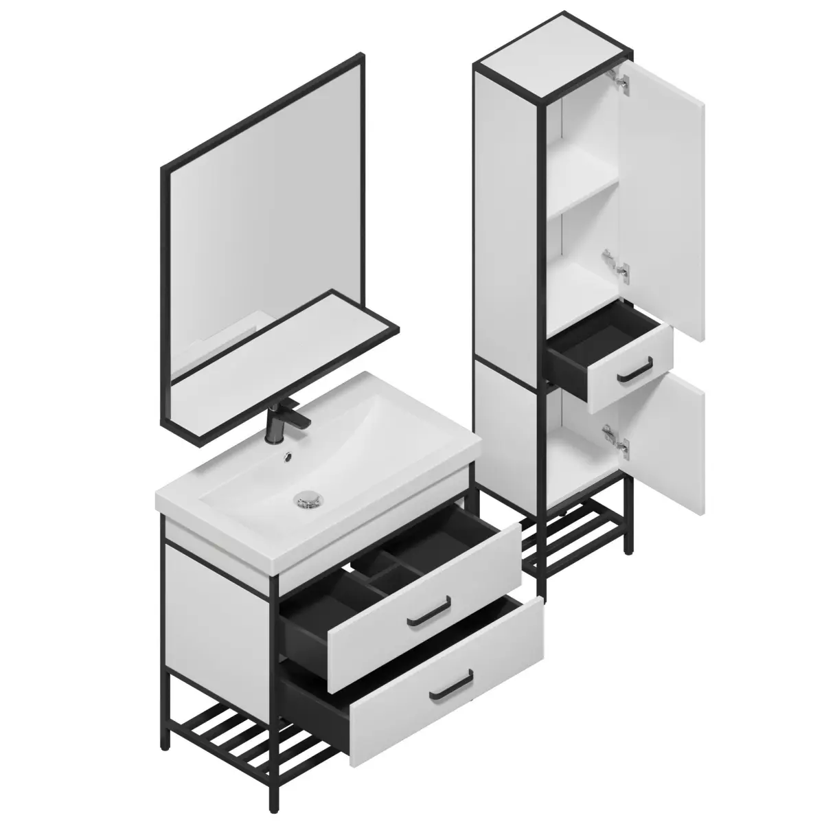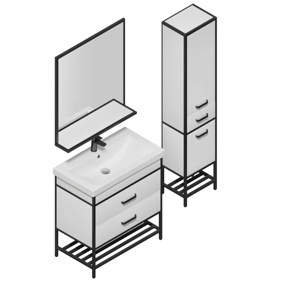 The Sanflor Nord series represents a modern take on bathroom design, offering an elegant mix of black metal frames and white facades. This combination not only enhances the visual appeal but also ensures practical functionality.