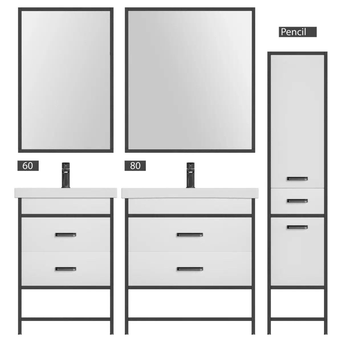 Cabinet 60: Dimensions (WxHxD): 558x434x800 mm Cabinet 80: Dimensions (WxHxD): 762x434x800 mm Color: Frame in Black Metal, Facade in White