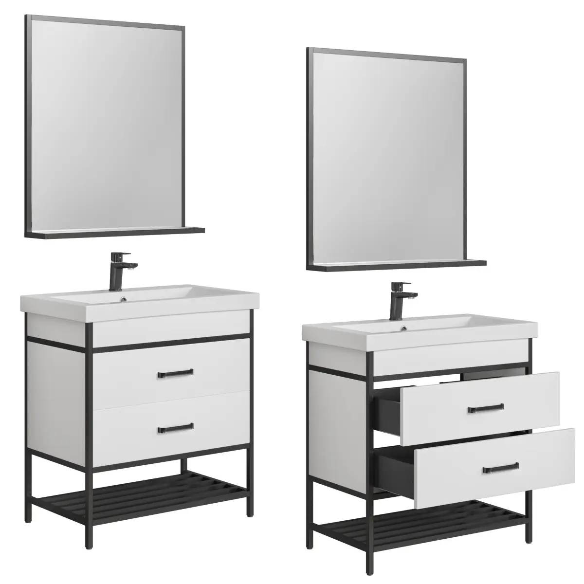 The Nord series is defined by its clean lines and contemporary finishes, making it a perfect selection for those looking to refresh their bathroom with furniture that is both stylish and functional. The stark contrast between the black metal frames and white facades provides a visually striking element to any bathroom setting.