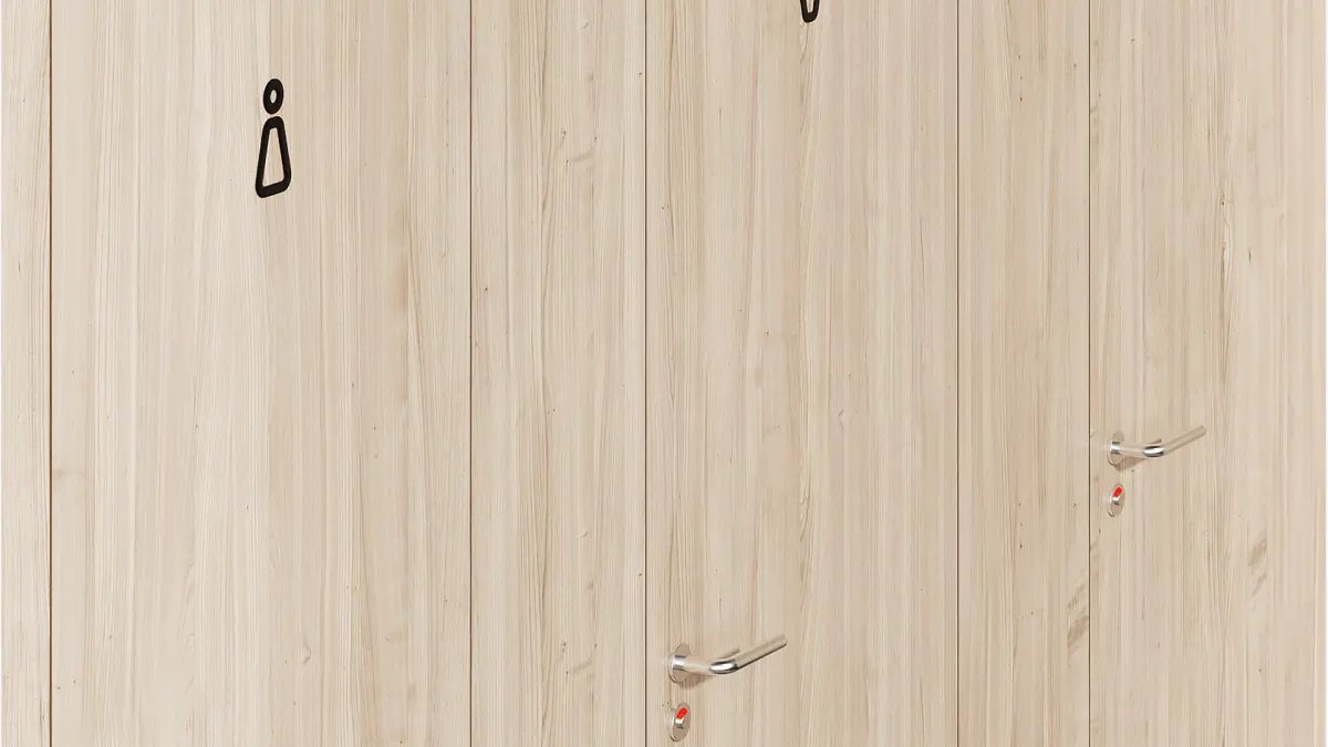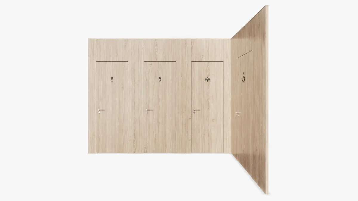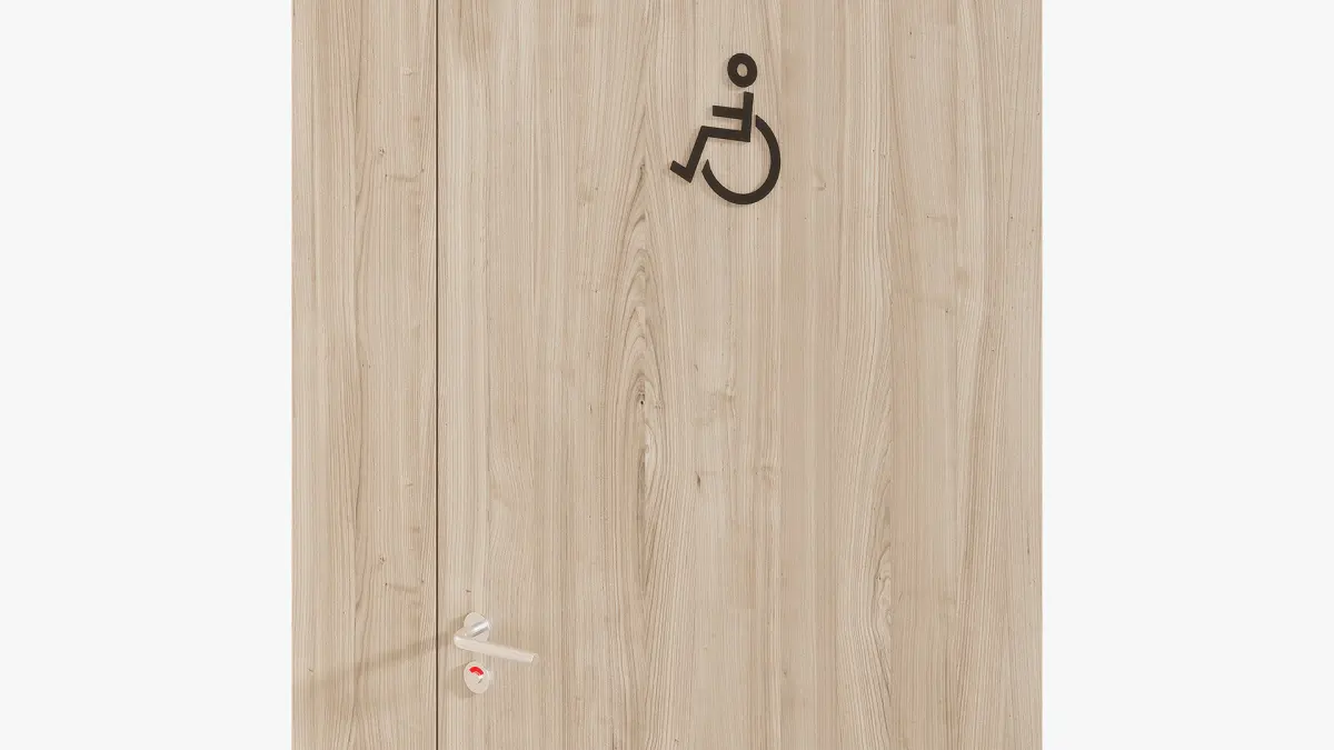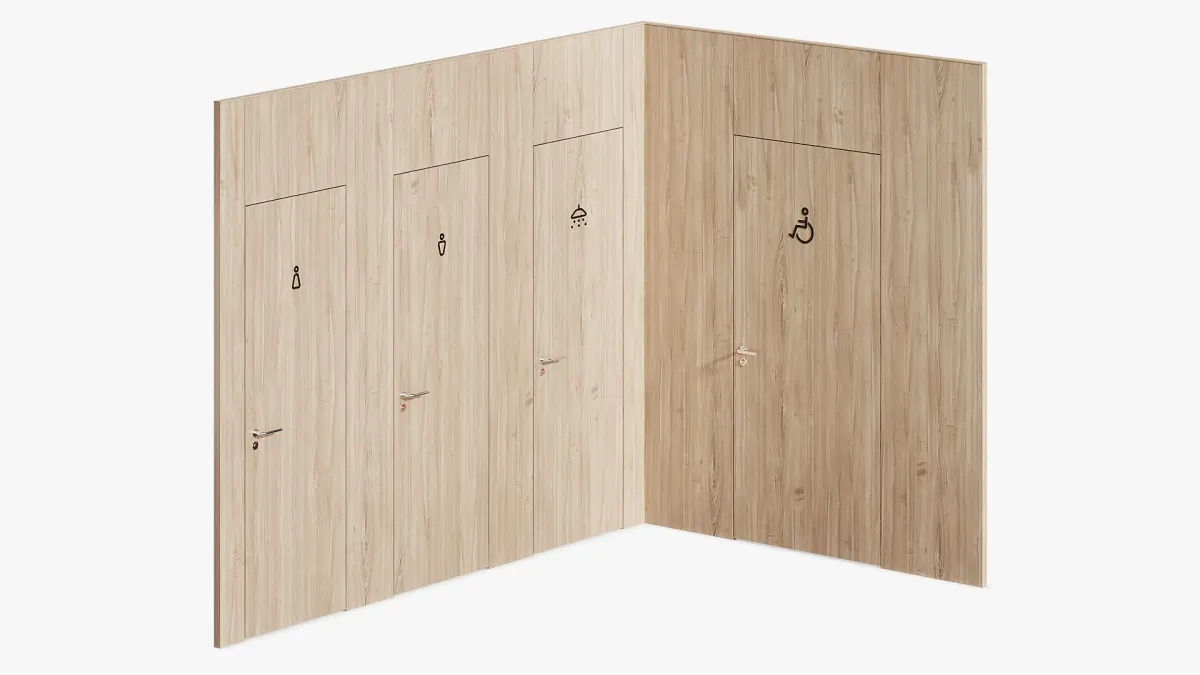 A sanitary partition with the designations of women's, men's toilets and showers with a doorway width of 700 mm. An additional sanitary partition with the designation of a toilet for low-mobility groups of the population with an increased door width of 900 mm. The partitions are equipped with chrome door handles.