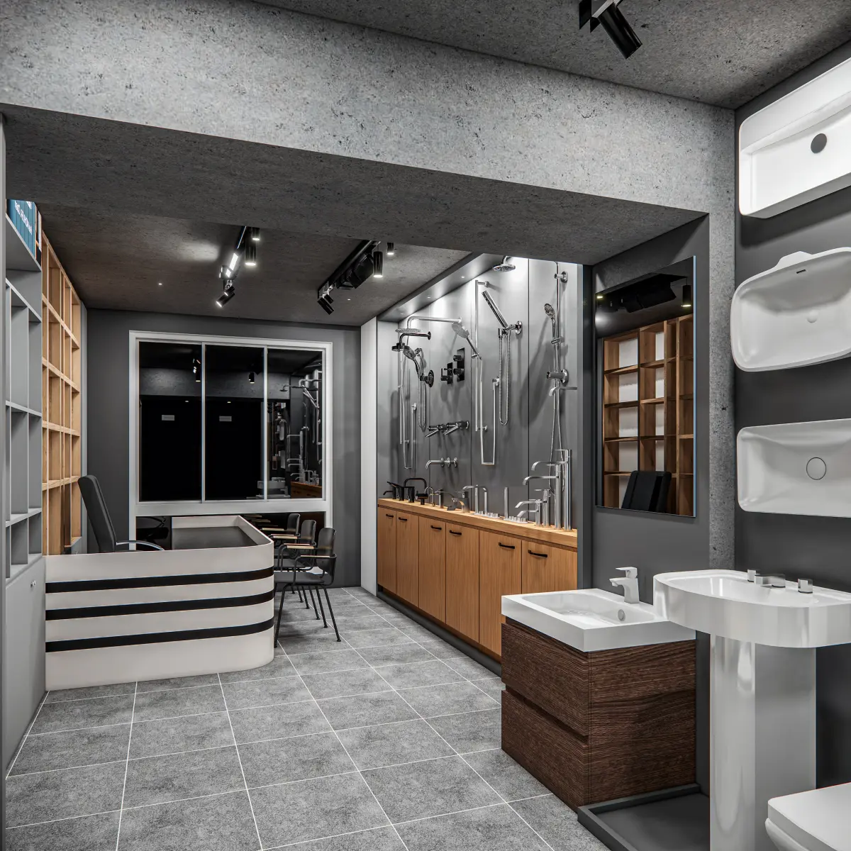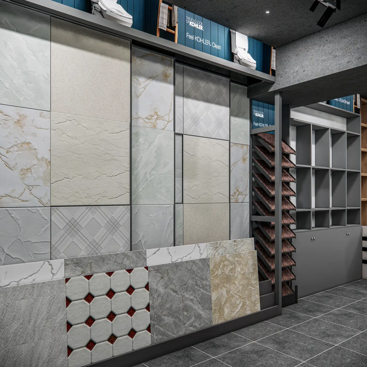 This high-quality 3D model showcases a comprehensive showroom interior meticulously designed to exhibit a wide range of construction-related products, including sanitary ware, marble slabs, tiles, and plumbing hardware. The layout is crafted to reflect a real-life showroom environment, optimized for spatial experience, product visibility, and customer engagement.