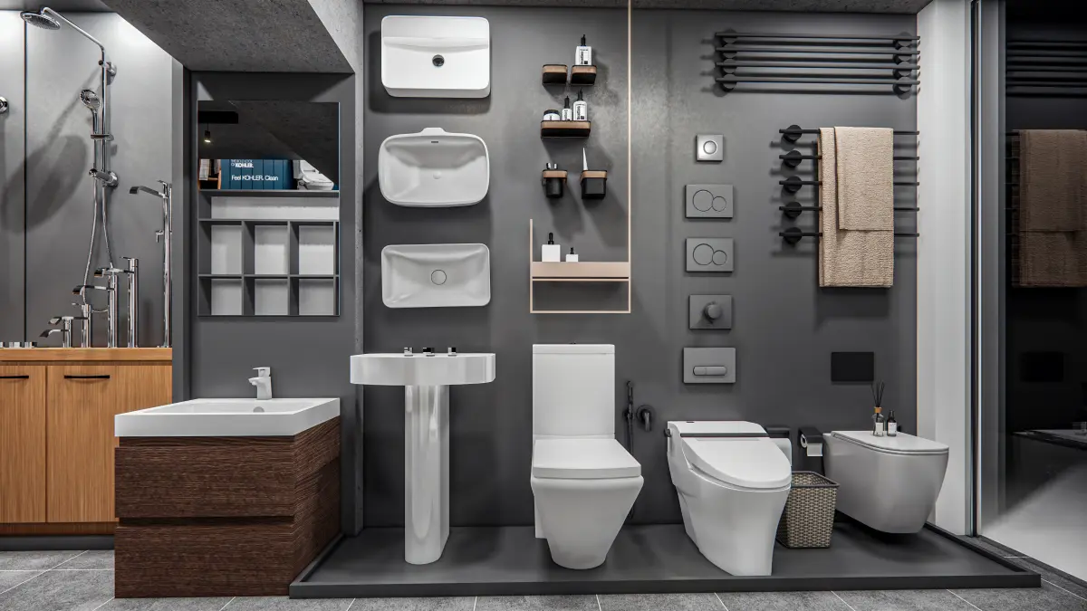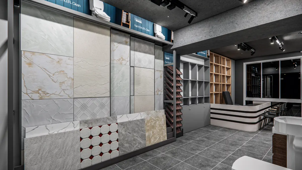 - Diverse Product Zones: Dedicated sections for sanitary ware, marble samples, ceramic and porcelain tiles, and construction-grade hardware fixtures.