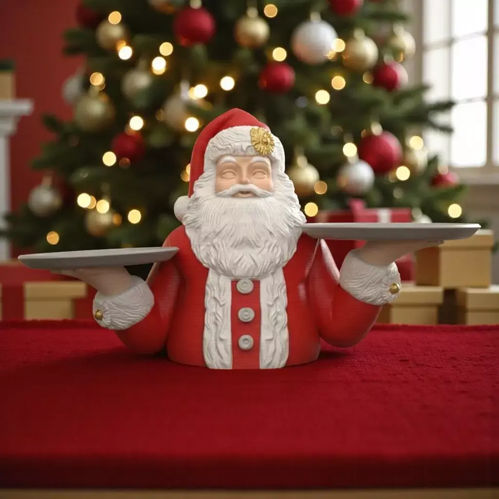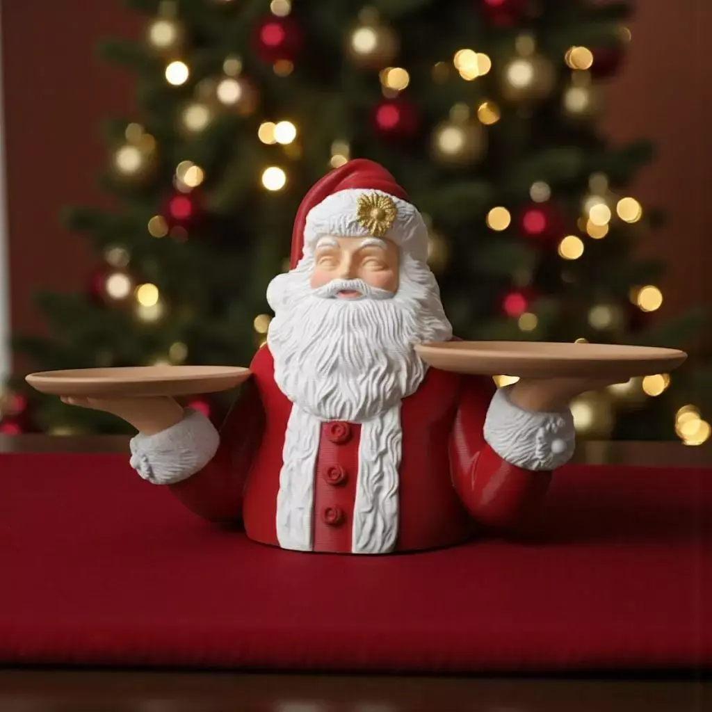 The model represents Santa Claus, designed as a decorative piece that functionally holds two small trays (or plates/bowls) in his hands.