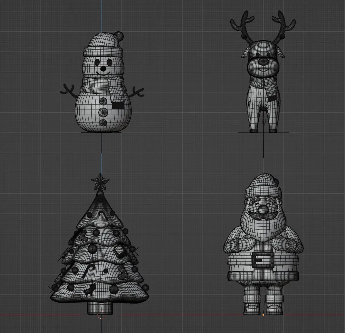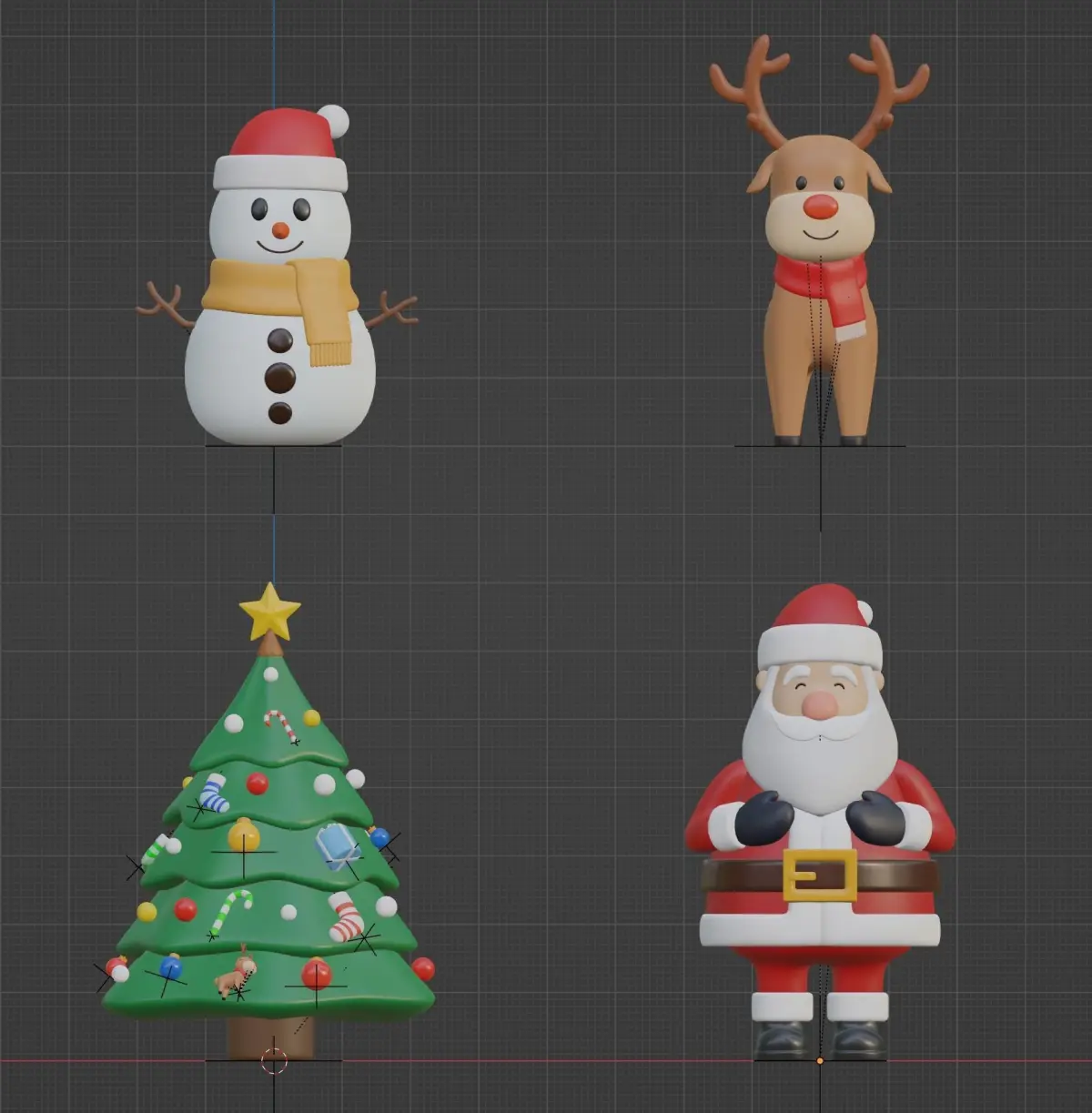 Christmas holiday celebration icon. Include with Smaily Santa Claus, Christmas tree with decorations, Smaily Red nose Reindeer with red scarf and Smaily Snow man with yellow scarf. Create by Blender 3D version 3.4