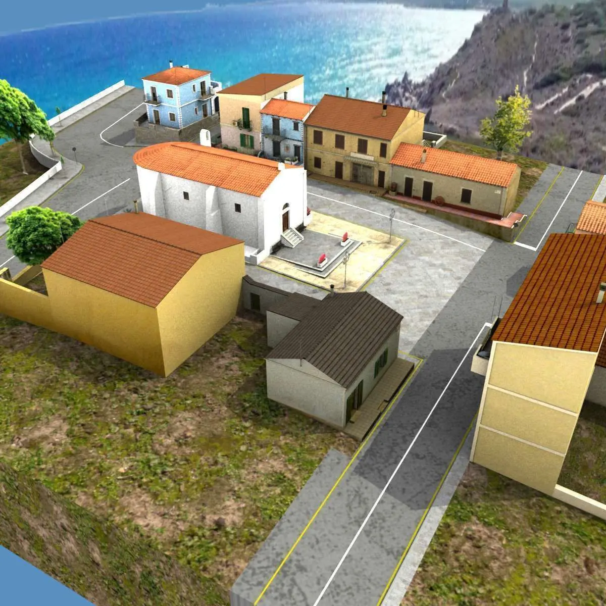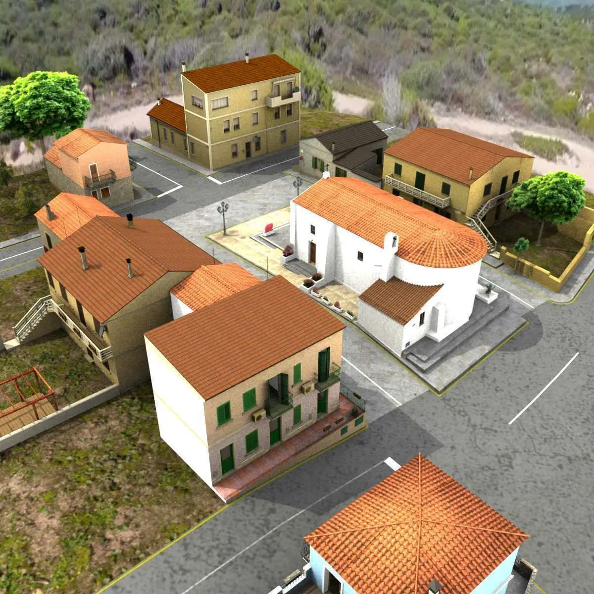 The Scene describes a typical fishermen small village square.The village is located in Italy, in the north of Sardinia island just in front of Bonifacio, Corsica; its name is Santa Teresa Gallura.The simple one-arch churh, built by Ponza sea-men coming in Sardinia for fishing, is named S.Lucia.The model, with the exception of the coast cyan house is a good reproduction of the present site.That house is the only one including detailed first floor interior , complete with furnitures; all others are only externally detailed. Textures, with very few exceptions in color, have been taken from pictures shut on site in order to conform to real aspect of buildings; that adds weight in terms of Mb to the model, that, otherwise, using simplified materials reach only 5Mb.Around the model a marine landscape has been positioned with sea, rocks and vegetation typical of the area.