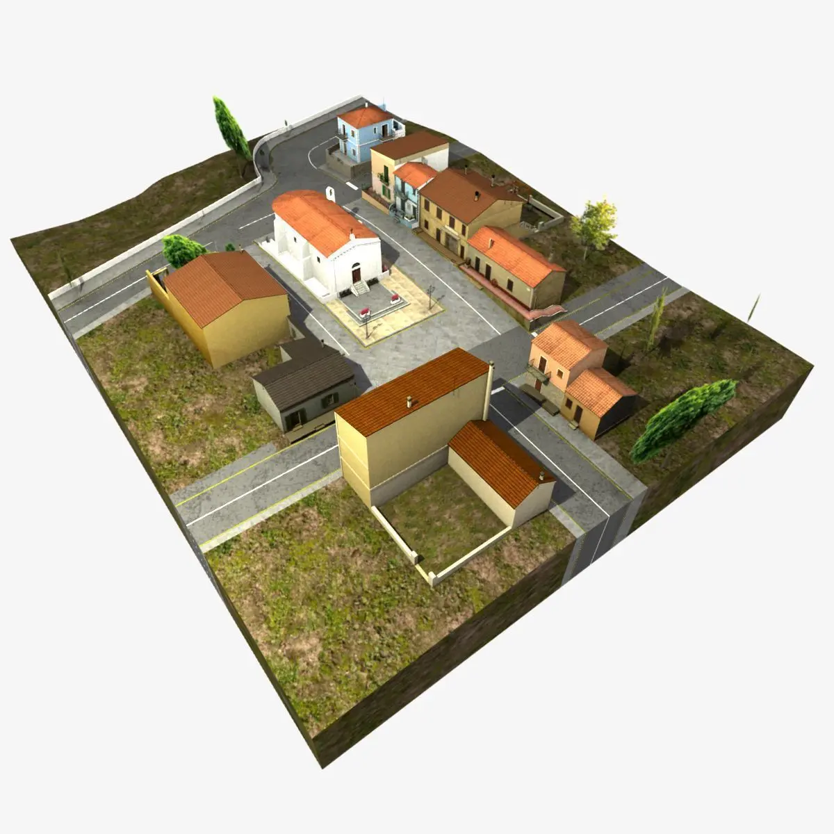 Model is modular, composed of 1 ground structure, 10 buildings, 2 gardens, trees, vases, road signals and a 360deg landscape.Some of the buildings include interior walls and simple forniture (2storey blue house and church).