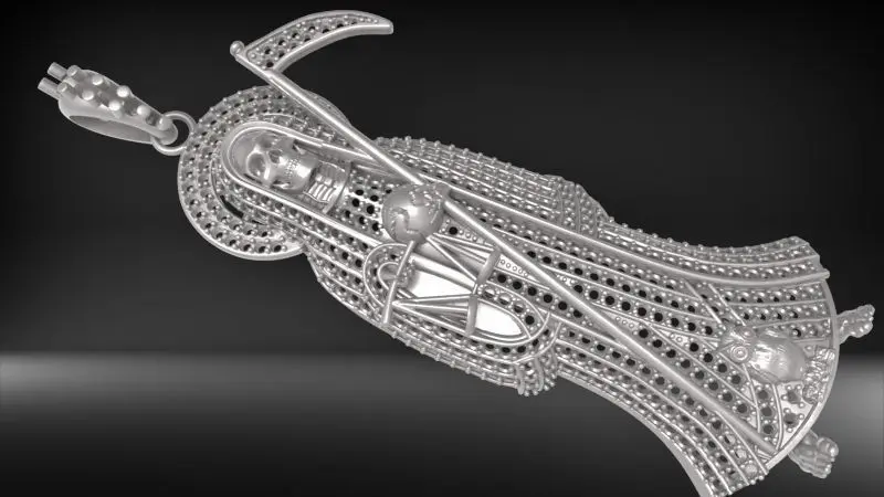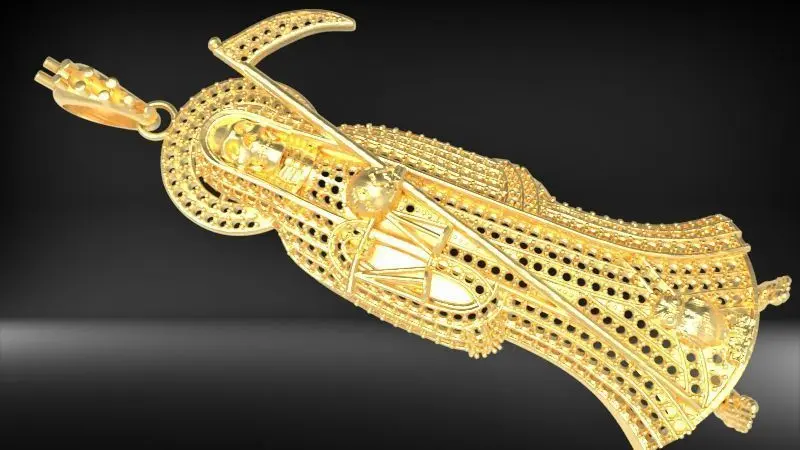 Santa Muerte Holy Death Grim Reaper Necklace Pendant Jewelry charm talisman depicting the Our Lady of the Holy Death Mexican folk saint religious sculpture Three-dimensional characters, vividly portrayed, features the image of the folk saint Santa Muerte, who represents healing, protection, financial wellbeing, and the safe delivery of souls to the afterlife. This product is designed in zbrush, This STL file is ready for 3D printing, Please look at the pictures for more information. This 3d model is not Rhino nurbs file. diamond size for the pendant 1.5mm and diamond size for the bail is displayed in the images. please check all the pictures.