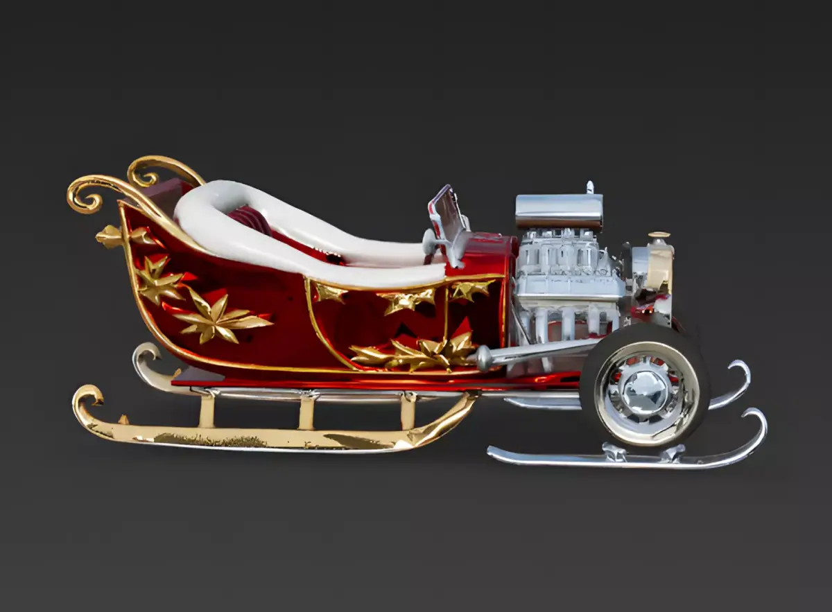 Chrome Supercharged Engine The front features a massive, exposed chrome engine with a huge air intake blower on top. The shiny exhaust pipes (headers) curve out from the side, suggesting this sleigh has enough horsepower to outrun any reindeer.