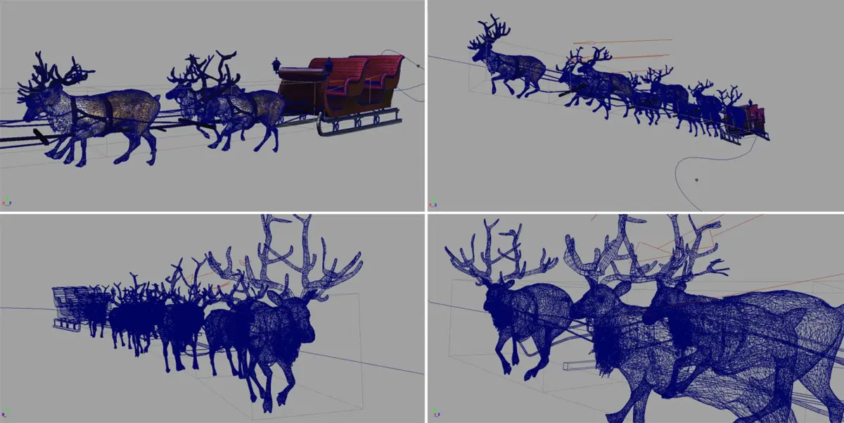 Professional fully rigged and animated along path photoreal reindeers with photoreal sleigh. Beautiful very high res textures, exactly made from real photographs of the real sleigh and reindeers, and excellently crafted geometry. You can fully adjust the path and speed of reindeers and sleigh. Reindeers and sleigh will physically bank and tilt on turns and bends of the path. All reindeers has own animations and move differently from each other, as well, as they have slightly different body shade and different horns for realism. Mental ray and lighting is fully setup for render, just hit RENDER to get exactly what you see on the stills and video. This is not cartoonish, but physically correct photoreal geometry and materials. This scene yet was used for several feature films. It can also be used for commercials, reels, and of course full HD feature films. Suitable for cinematic closeups. Will save you weeks of work. Enjoy your purchase!