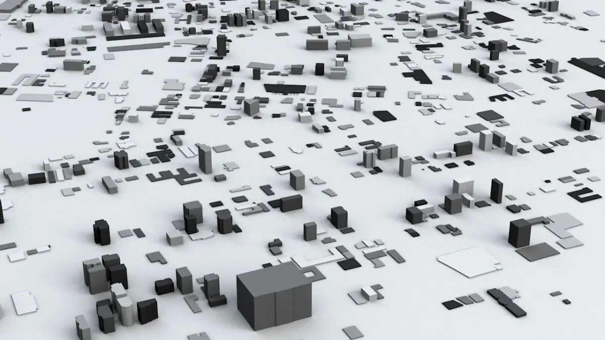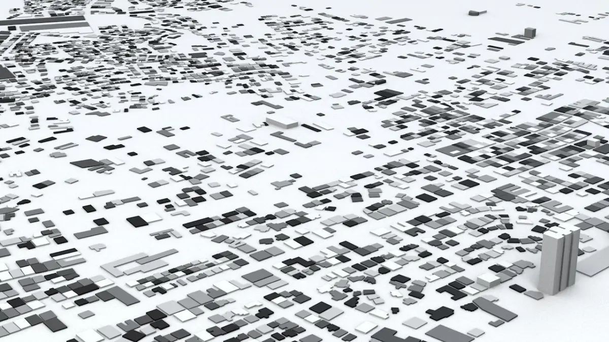 - the model is positioned on a flat surface (all buildings are on the “floor” - no elevation data included)