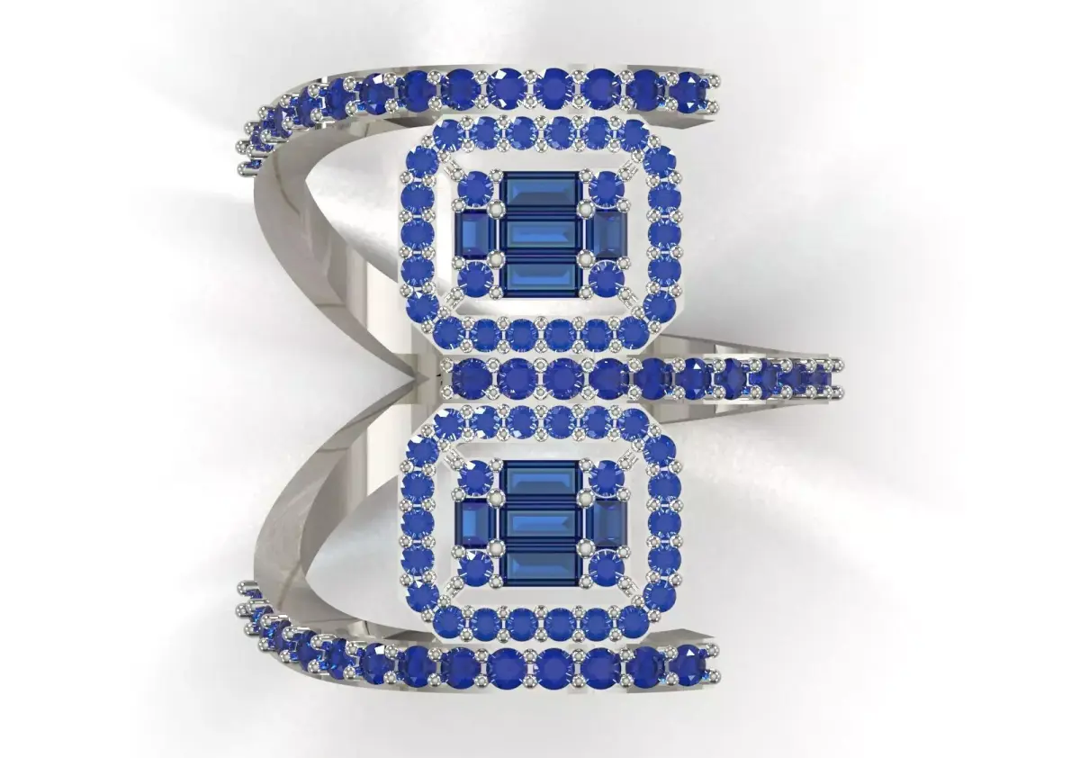 - Center Stone: Each of the two upper sections has one or more Emerald Cut Sapphires set in the center.
