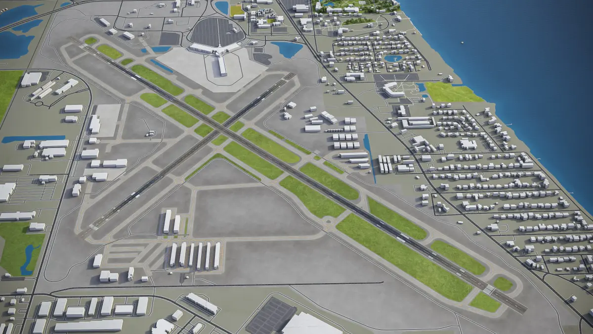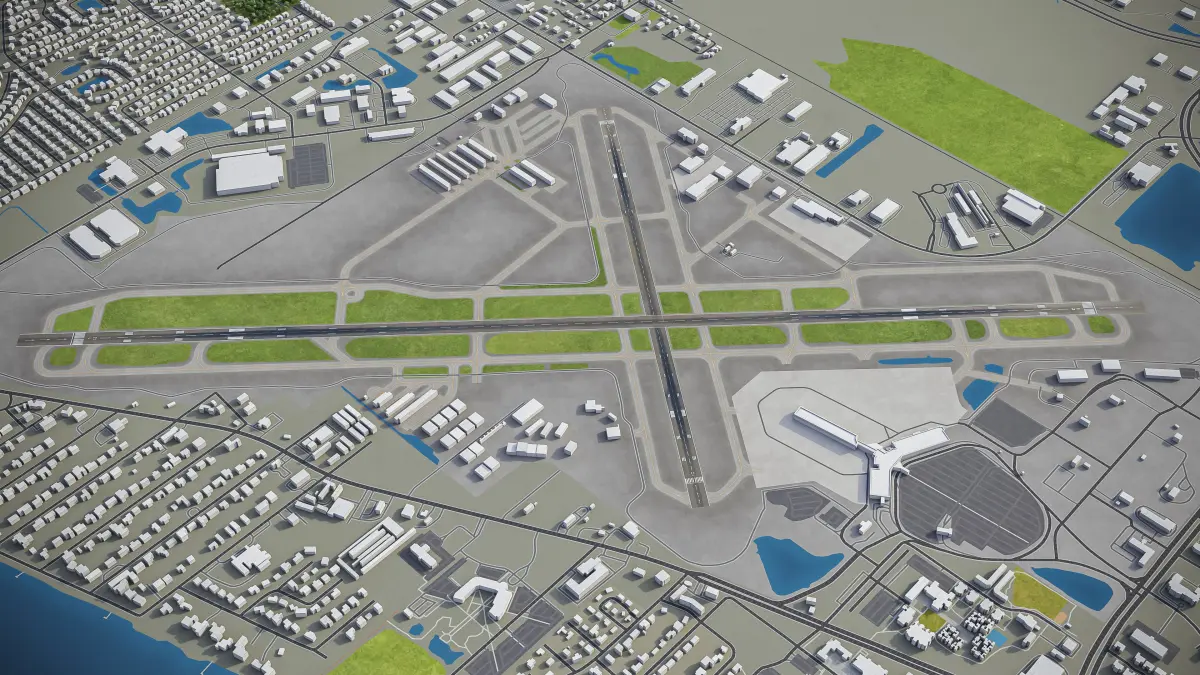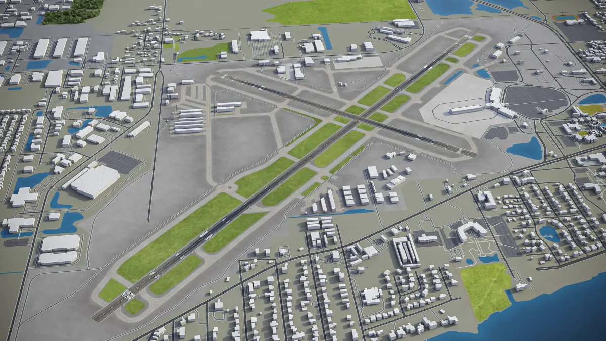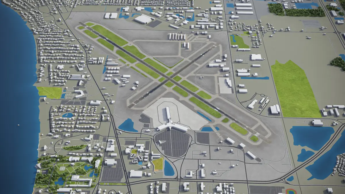 This is exact and accurate to-scale 3D model of Sarasota Bradenton International Airport (SRQ) and its surrounding area based on GIS data (August 2021)