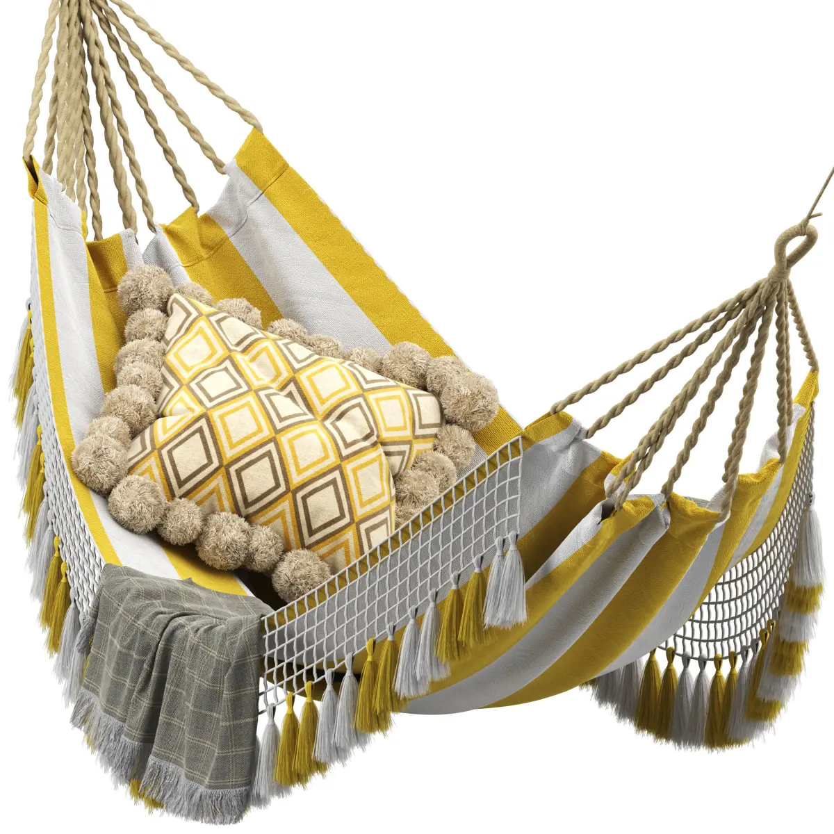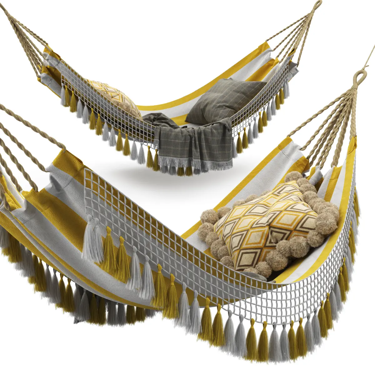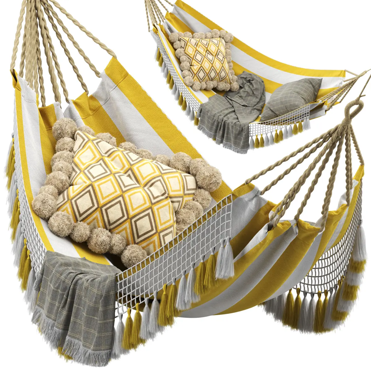 Saratoga hammock 3D model, wicker hanging chair 3Ds Max, suspended lounge chair FBX, V-Ray outdoor hammock asset, boho hammock with pillows 3D.