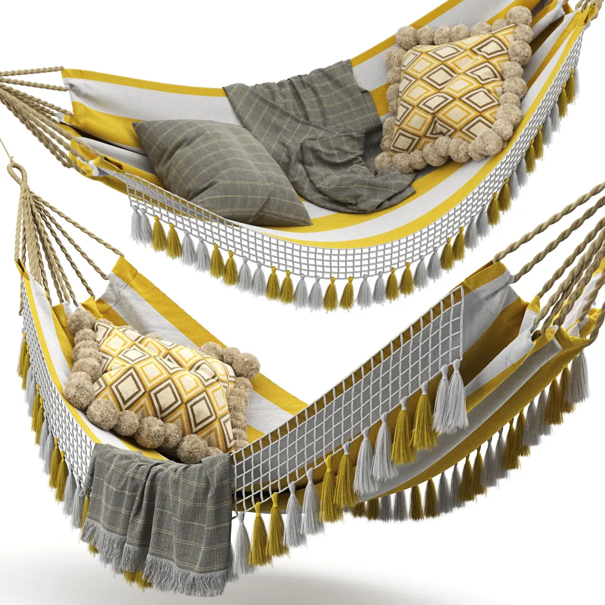 Relaxed, resort-style comfort in one drop-in asset: the Saratoga Hammock combines a woven fabric cradle, layered cushions and a soft fringe skirt to create an inviting focal point for pool decks, patios or boho living rooms. The model’s gently arched frame and loose plaid throw suggest an effortless “vacation” vibe, while the tidy quad topology keeps the geometry friendly for both close-ups and wider shots.