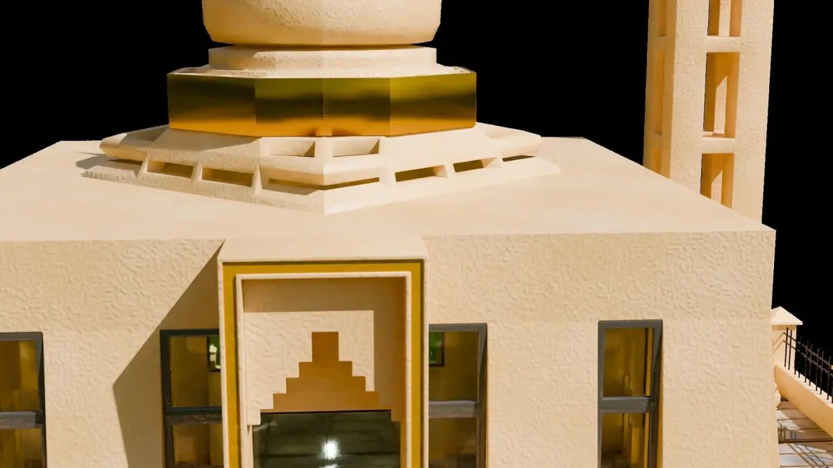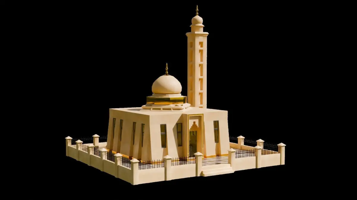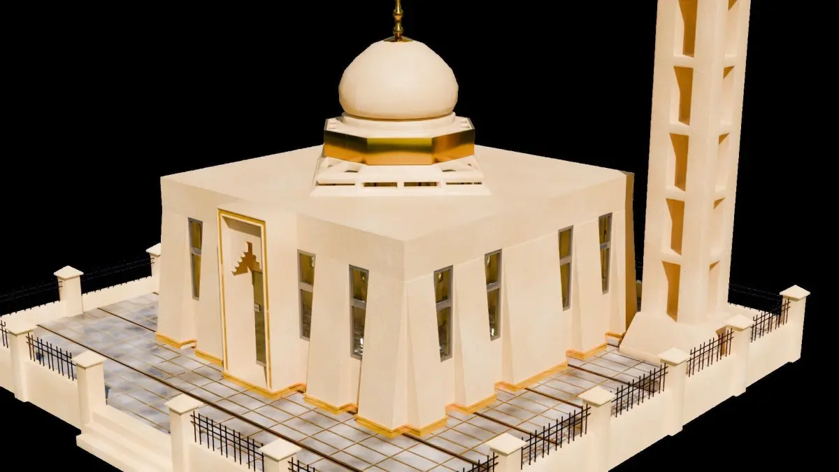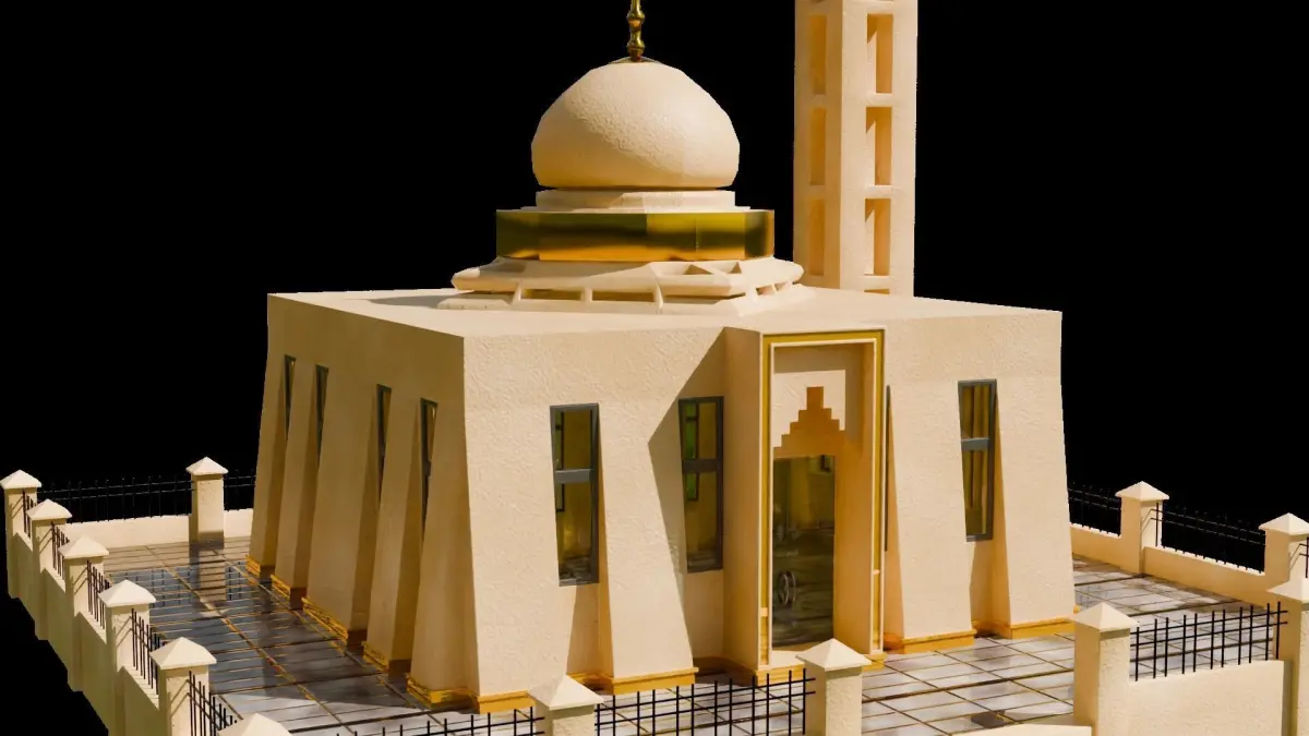 3D model of a masjid (mosque), with a cemented walls and paint. Outer walls with Metallic grill. Floor with material added for rows (saff).