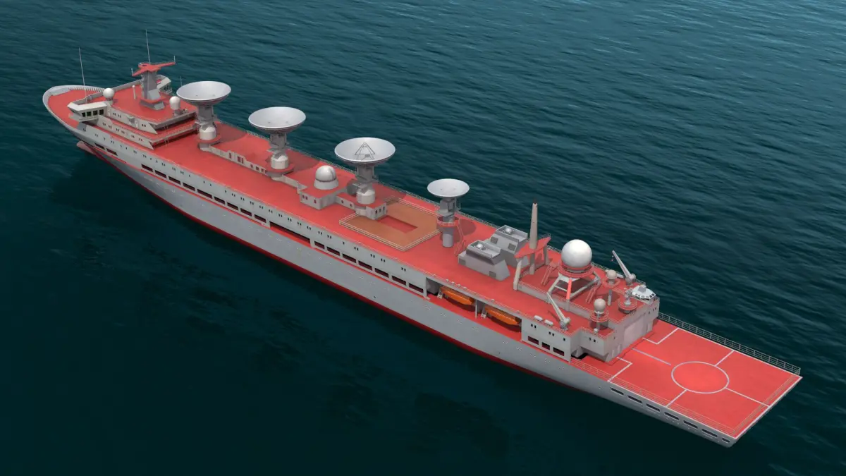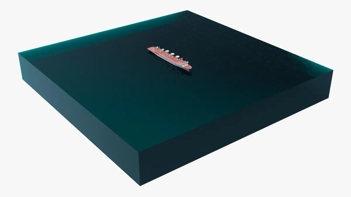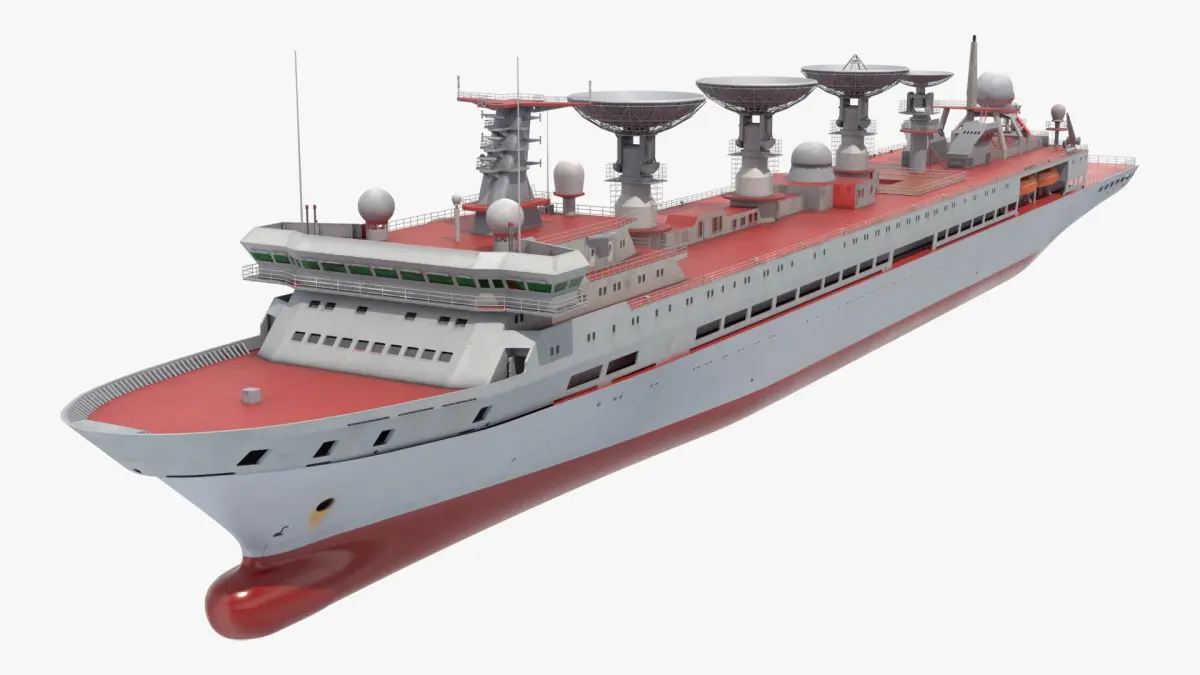 Satellite Tracking Ship with Parabolic Dishes Red In Water Simplified is a 3d model of a cutting-edge oceanographic research vessel, specifically designed for scientific exploration and data collection at sea.