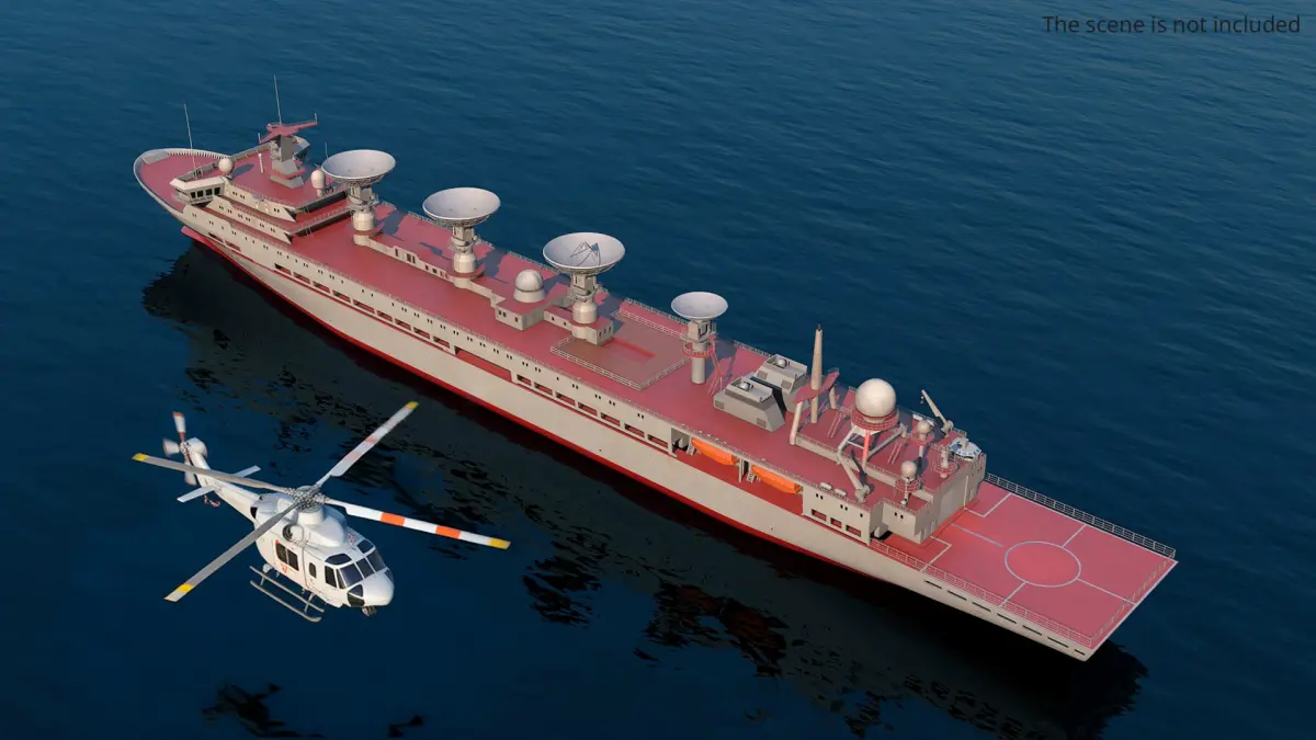 Satellite Tracking Ship with Parabolic Dishes Red In Water Simplified is a high quality, photo real 3d model that will enhance detail and realism to any of your rendering projects. The model has a fully textured, detailed design that allows for close-up renders, and was originally modeled in 3ds Max 2020 and rendered with V-Ray. Renders have no postprocessing!