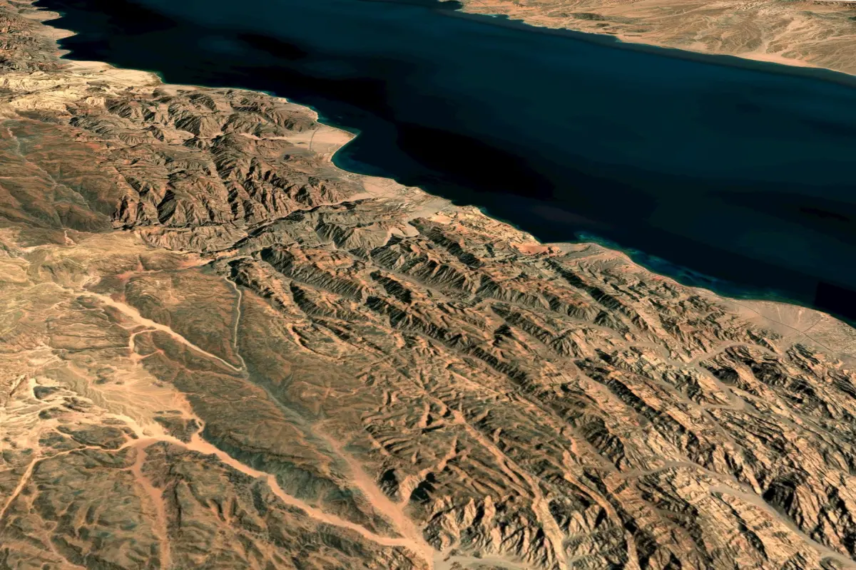 Terrain model of a region in Suadi Arabia, where project NEOM LINE is under development. THE LINE, a revolution in urban living at NEOM, and a blueprint for how people and planet can co-exist in harmony.