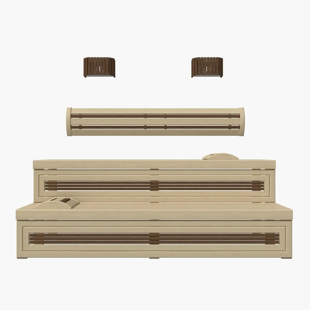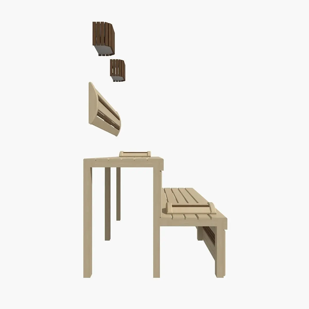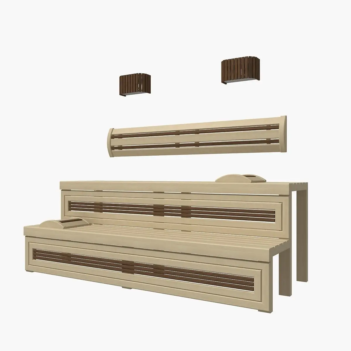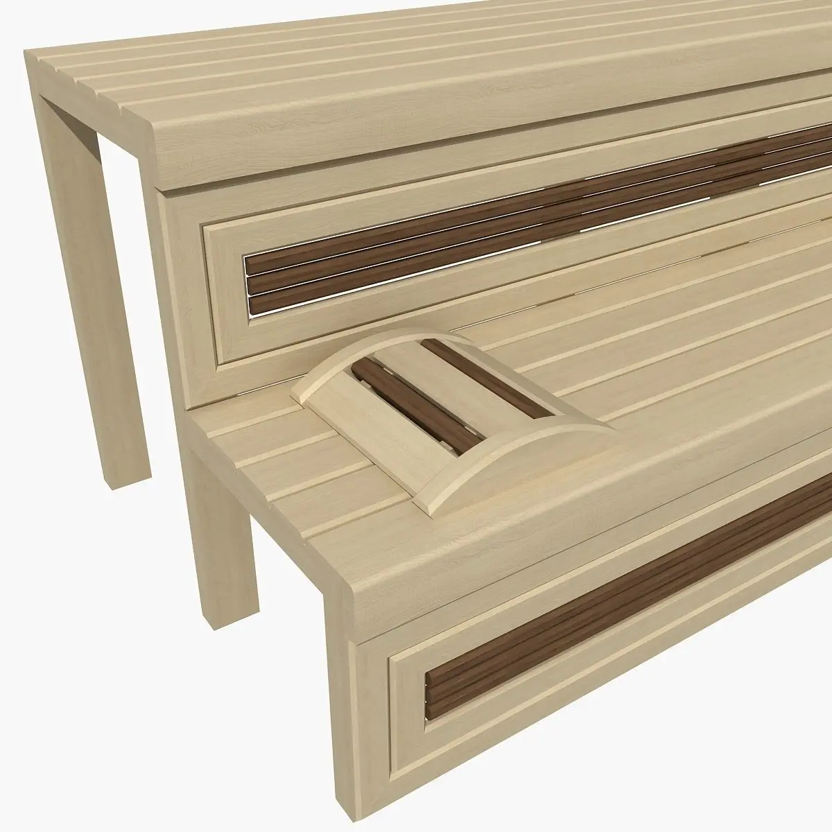 Real scale model of sauna bench in dark and light wood.