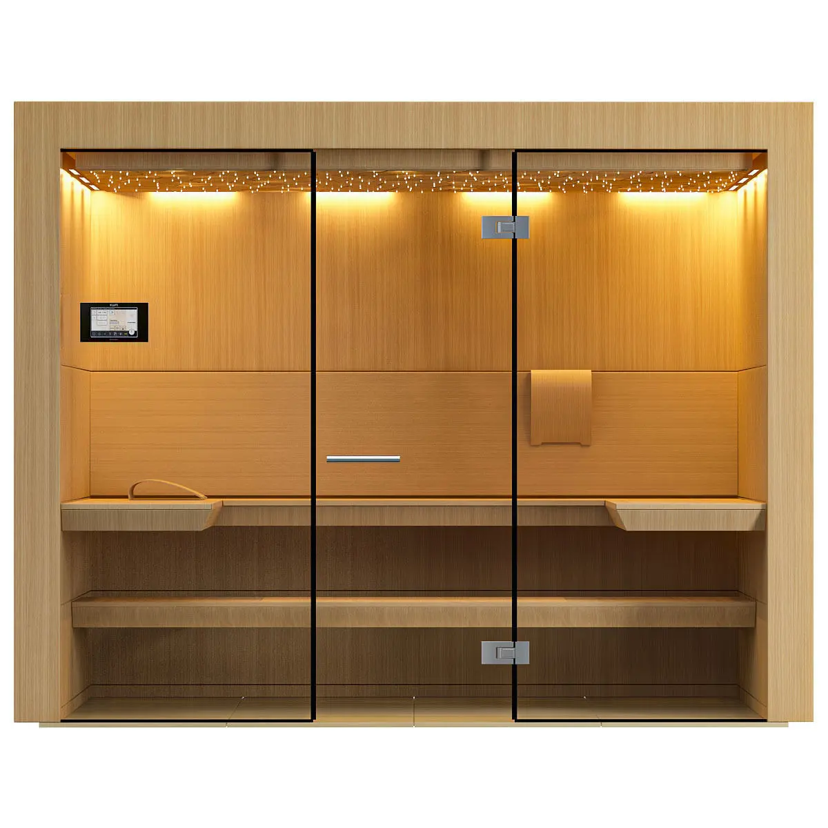 Name: Sauna CASENAType: modelFormat: 3Ds Max 2015Export: FBX, OBJ, 3DSRender: VRay (4.x), Corona (5)Polys: 6203680Verts: 3114686Matclasses: VRayMtl,VRayLightMtl,CoronaLightMtl,CoronaMtlUnits: MillimetersDimension: 6455.19 x 3301.69 x 2277.14Thanks to a large glass front with exterior panelling in wenge on the front wall, the CASENA sauna provides a direct view into its interior.