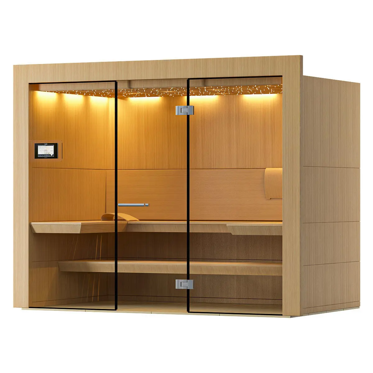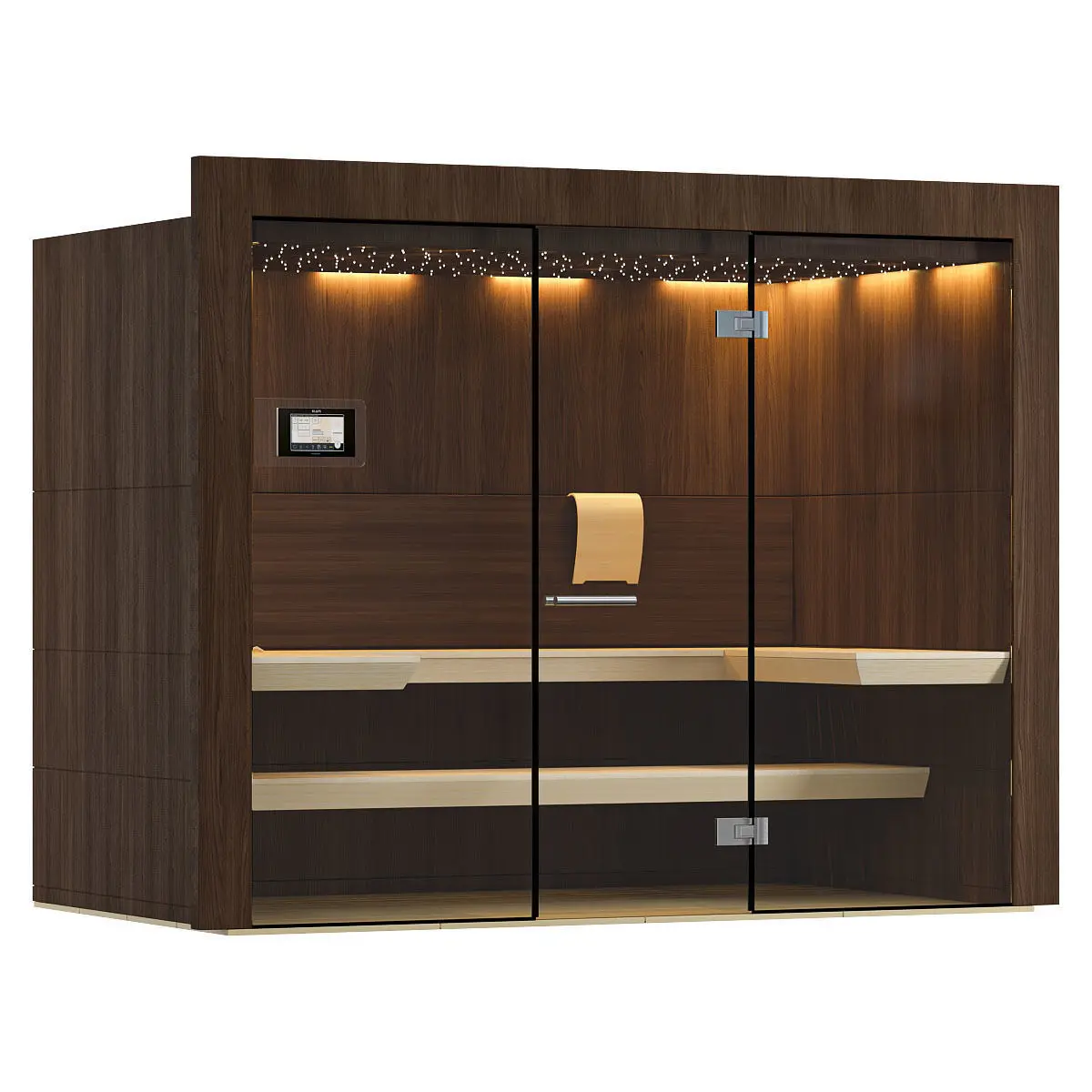 With its floating benches and frameless glass front, the CASENA sauna is an absolute design highlightCustomised fixtures such as size adjustments and height changes in 10 cm increments are possible.CURVE ceiling in wengeInterior panelling also available in dark wenge veneer panelsThe exterior panelling can be selected from a range of wooden panels.BONATHERM underbench sauna heating system creates additional seats.Assembly is carried out by our trained specialist fitters.