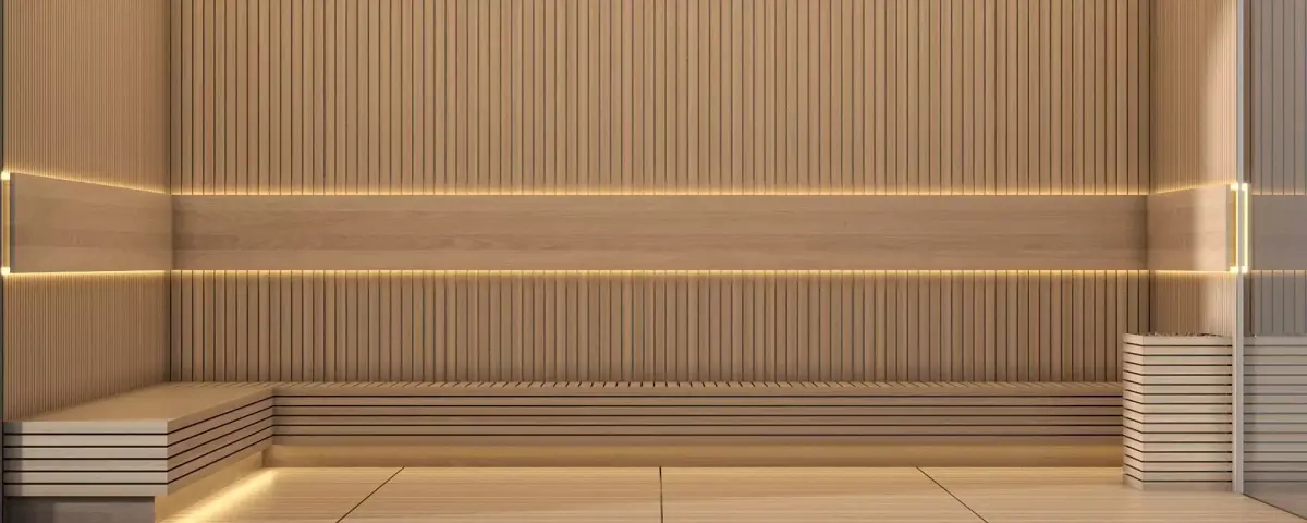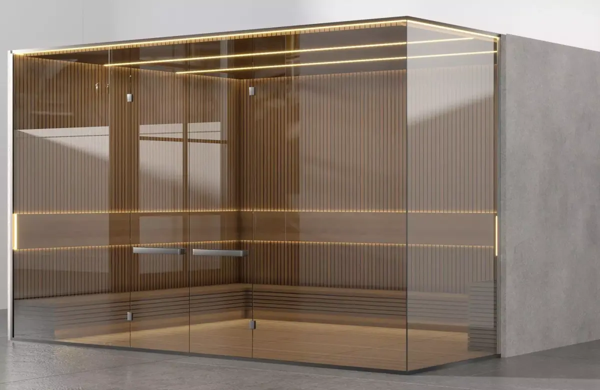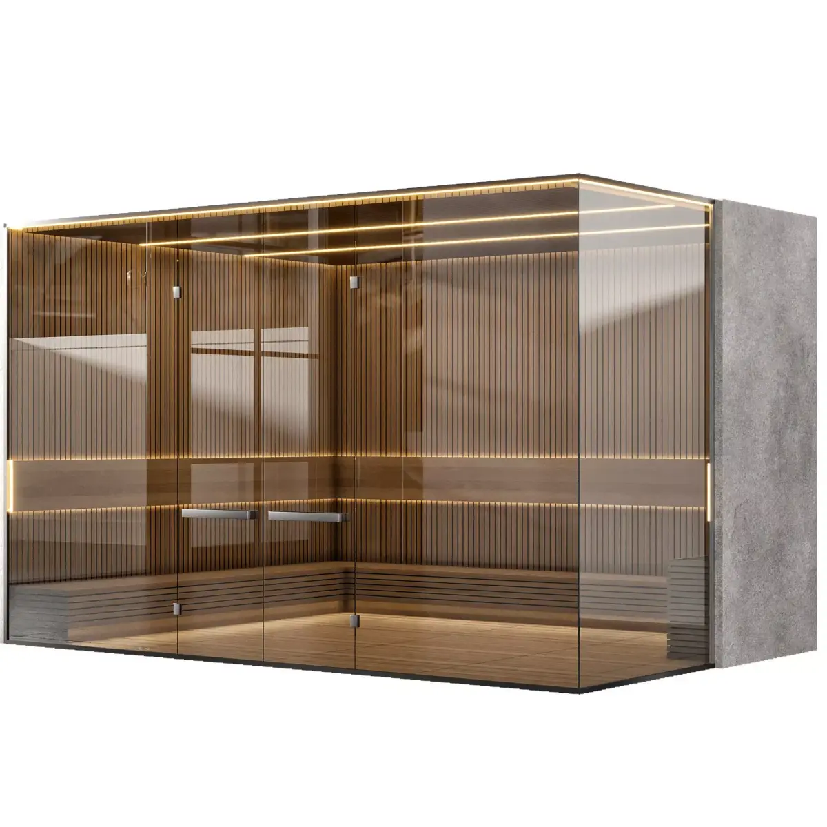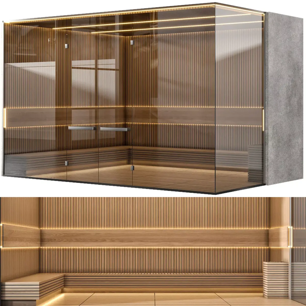 3D model of a luxury wooden sauna room with glass door and integrated LED lighting.Clean design with wooden panels, built-in benches, and warm ambient light. Perfect for architectural visualization of spa centers, hotels, luxury homes, and wellness projects. Optimized geometry and realistic materials ensure efficient rendering and smooth workflow.